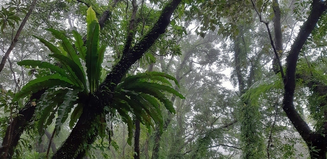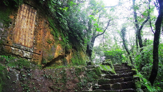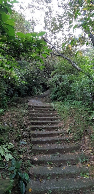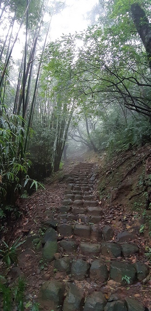 我們在金字碑稍作休息後續行,從金字碑到探幽亭這一段越嶺步道,是古道上最優美且古色古香的路段。這一帶的山徑保留了古樸的石階,樹林蓊鬱繁茂,不少鳥巢蕨附生於樹幹,而且途中還會經過一小段竹叢,翠綠的竹子隨風搖曳,發出細細沙沙的聲音,清幽的景色,讓這一帶充滿了原始的風貌。