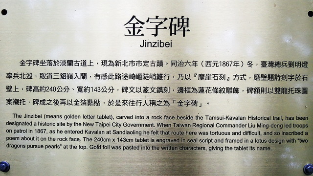 金字碑坐落於淡蘭古道上,現為新北市市定古蹟。同治六年(西元1867年)冬,臺灣總兵劉明燈率兵北巡,取道三貂嶺入蘭,有感此路途崎嶇陡峭難行,乃以『摩崖石刻』方式,磨壁題詩刻字於石壁上,碑高約240公分、寬約143公分,碑文以篆文鐫刻,邊框為蓮花條紋雕飾,碑額則以雙龍托珠圖案襯托,碑成之後再以金箔黏貼,於是來往行人稱之為「金字碑」。