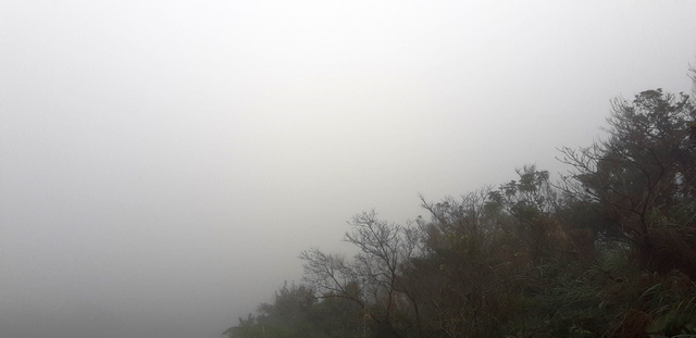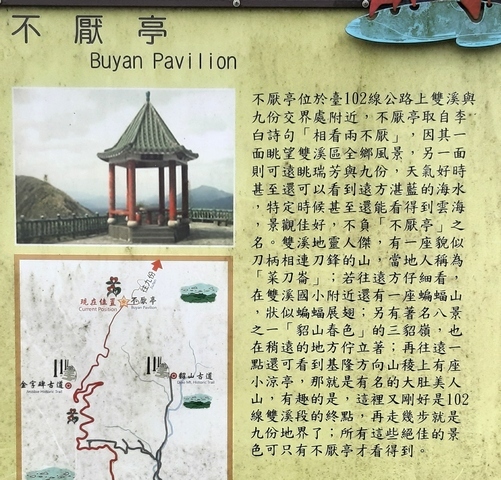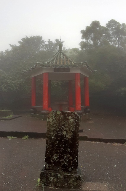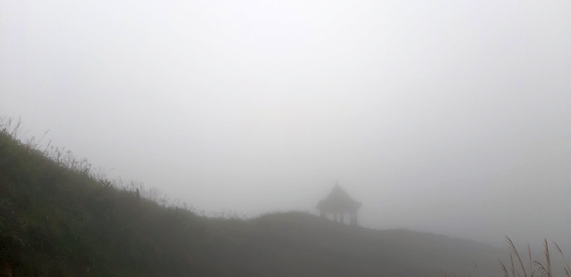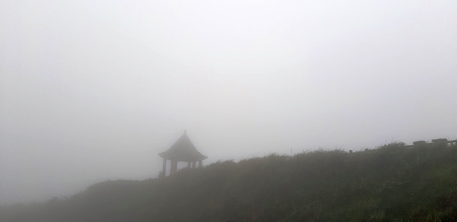 我們沿著102公路往上爬坡前往「不厭亭」,走了約20分鐘來到「不厭亭」,只可惜當天天氣不佳,整個山頭籠罩在濃霧之中,時而飄起毛毛細雨,眼前白茫茫一片,無緣欣賞到這一帶美景。