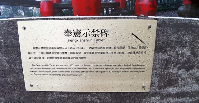 奉憲示禁碑立於清代咸豐元年(西元1851年),因當時山民任意燒林砍伐開墾,往來旅人蒙受日曬所苦,三貂仕紳請命官署示憲禁止山民濫墾,規定道路兩旁須留地三丈禁止砍伐,後由仕紳自行資立碑於嶺頂。此碑也被譽為臺灣最早的環保碑文。