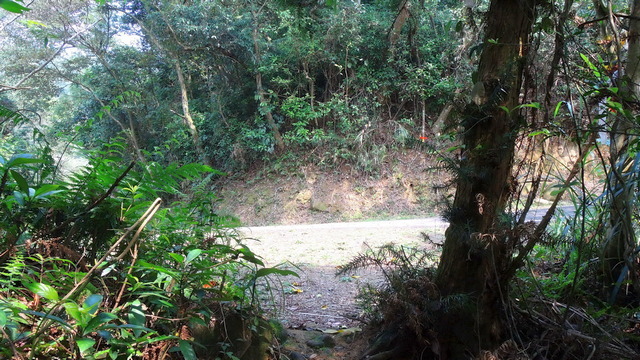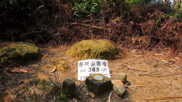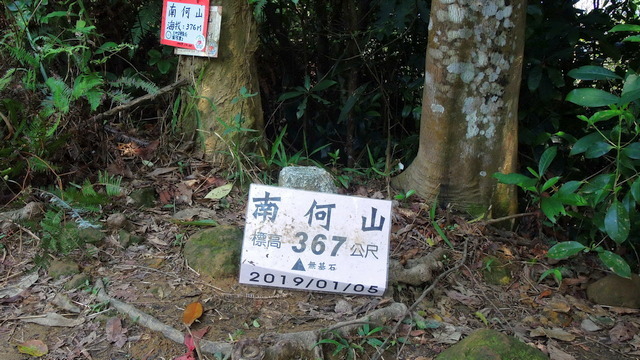 前面遇到岔路,向下往自然谷環境信託基地走了幾步,路況太差了,只能用人煙罕至、蠱毒瘴癘來形容。很快的就掉頭了,回到剛才的岔路,向上走沒兩三步,就到了南何山三角點,海拔367公尺。飛沙縱走的三角點幾乎都沒甚麼展望,要不是登山社團在這裡插旗,否則根本就意識不到這裡就是個三角點。