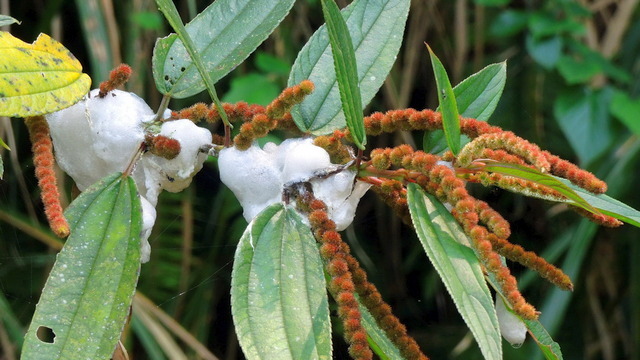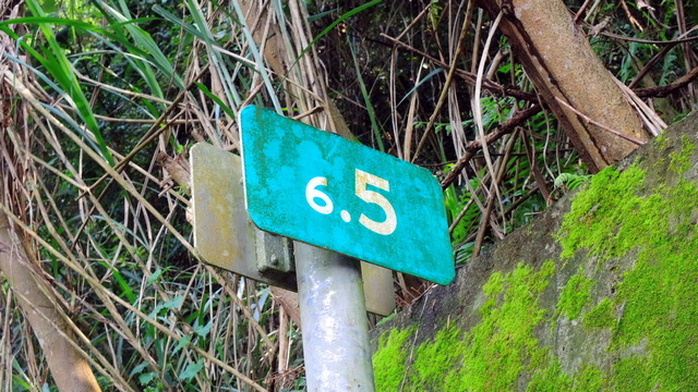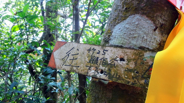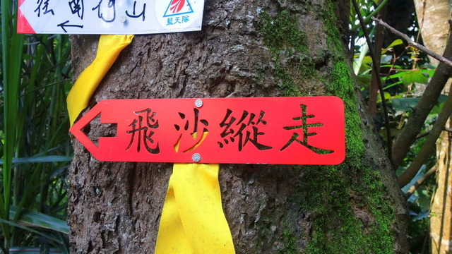 時隔一週重返這條路,路上結滿了蜘蛛網,只要一不小心就會覺得身上黏黏的,到最後乾脆把帽子拿下來不斷揮舞,一路上不斷與蜘蛛網纏鬥。沿路有飛沙縱走的指引牌,這可以說是最高級的登山指示牌,因為是鈑金雷射雕刻之後再烤漆,不過有些金屬表面在最後酸洗過程沒有做好,所以烤漆整片剝落。