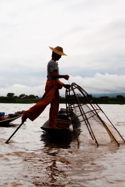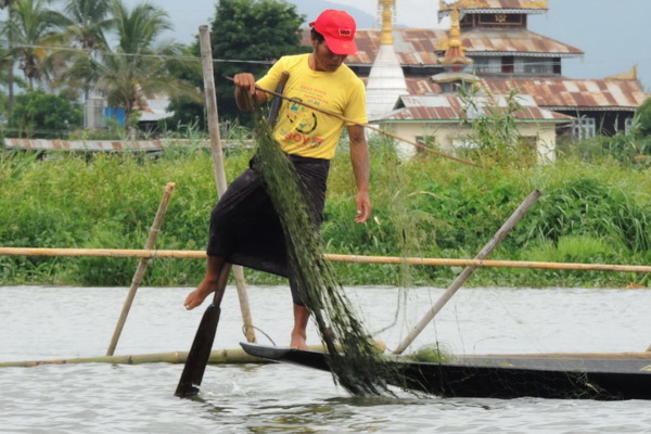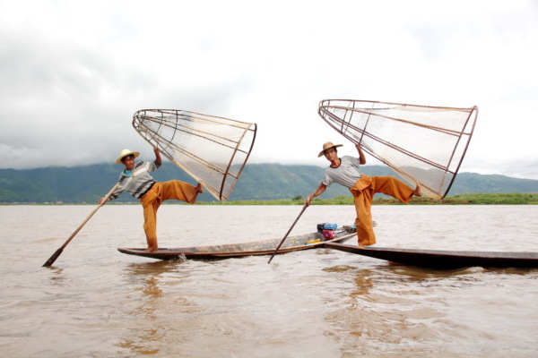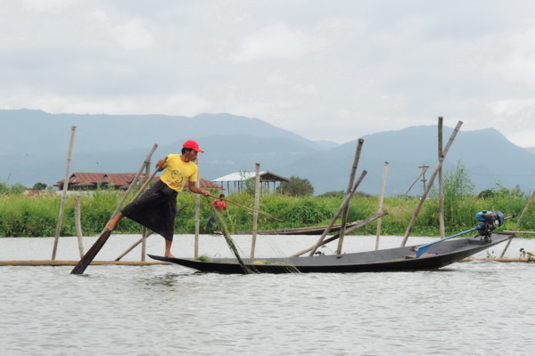 單腳劃船捕魚:茵萊湖上的「世界上獨一無二的單腳劃船」特殊景象,這裡的每一位漁夫都會用單腳劃槳,同一時間用雙手撒網捕魚。