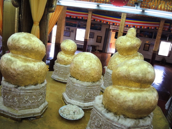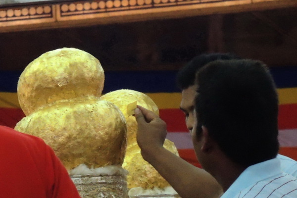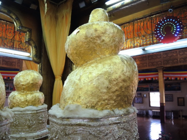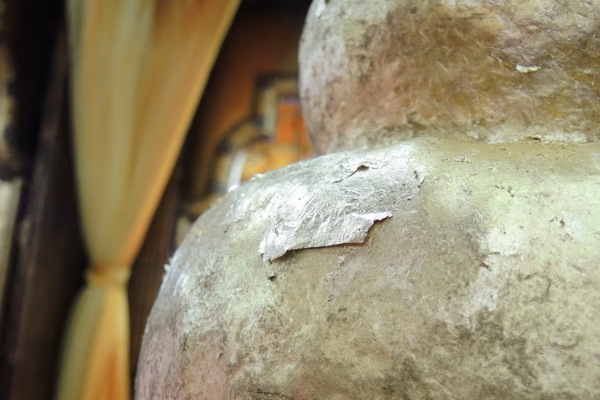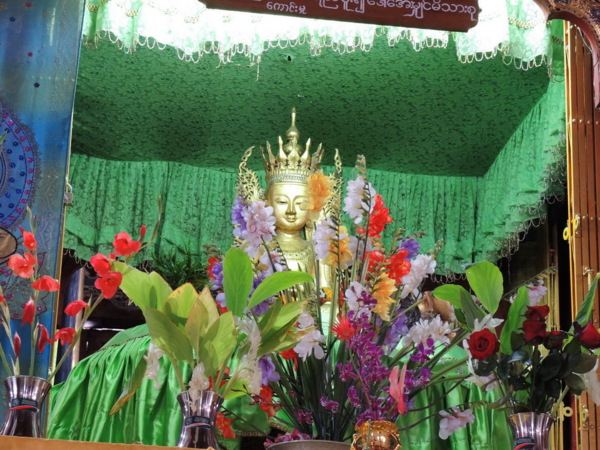 牆上照片告訴我們緬甸的軍領袖搭乘直升機來參拜和貼金。彭都奧佛塔的古佛像貼滿金箔,造成佛像已辯不清五官、四肢等輪廓。