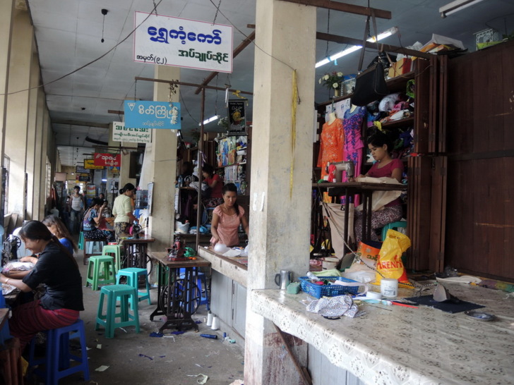 仰光市內最大的旅遊工藝品市場,有各種天然的寶石玉器、金銀飾品和傳統工藝品出售,號稱是外國遊客的購物天堂。個人覺得比較像緬甸版的迪化街,也是緬甸人的購物天堂,販賣各式各樣的日常用品:吃的、喝的、穿的、用的,統統都有,還有一個區域是現場設計和裁縫衣服,就像是個人的工作室。