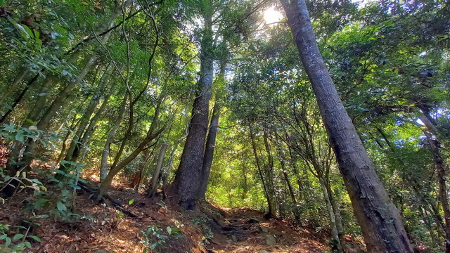 今天不必走太快,慢慢地走不要讓自己喘氣,自然就可以享受這趟避暑清涼的森林浴。遠方潺潺流水,耳邊蟲鳴鳥叫,今天登山客雖多,但大多是三三兩兩,還有一些人揹重裝備來鍛鍊,所以不會有進香團的喧譁聲,也沒有無品人隨身揹喇叭吵鬧,只有腳步聲讓這條寧靜的山路生氣盎然。