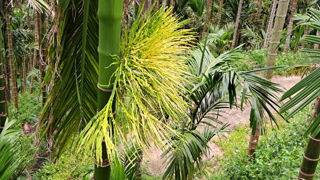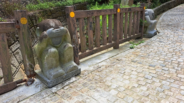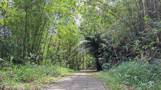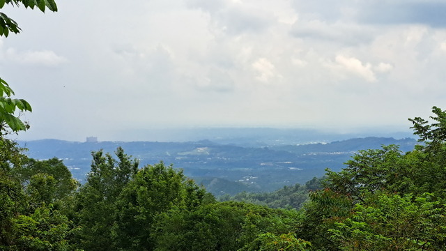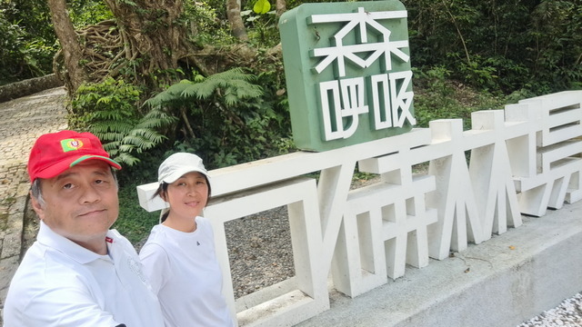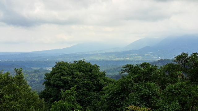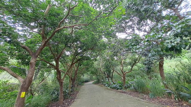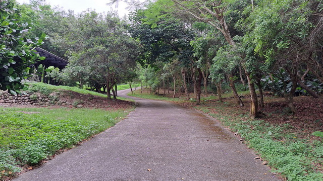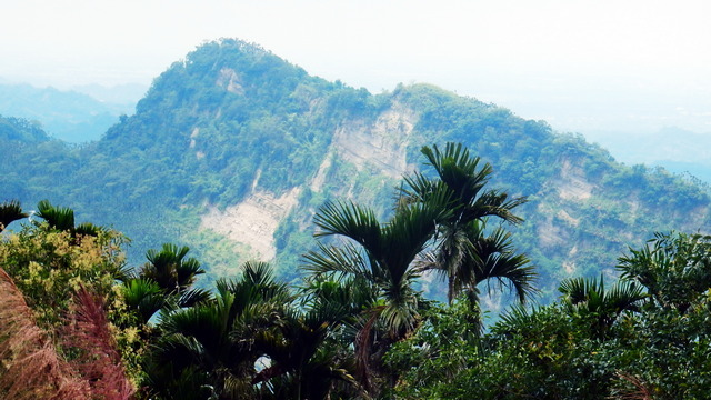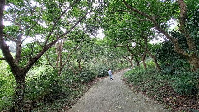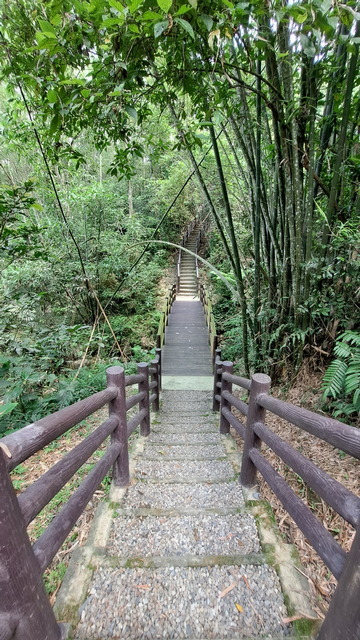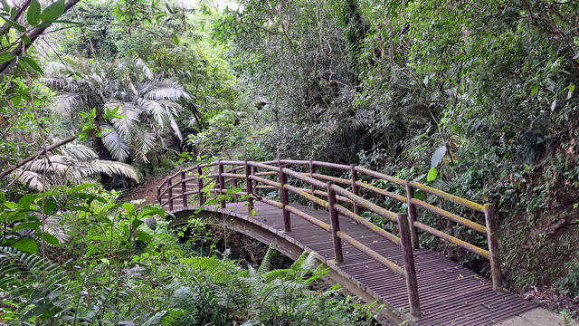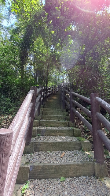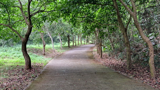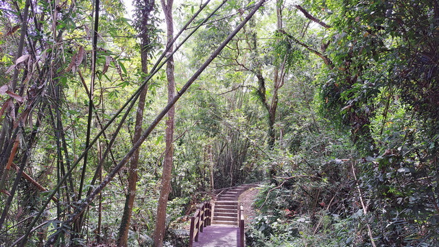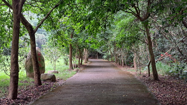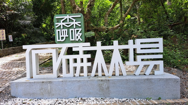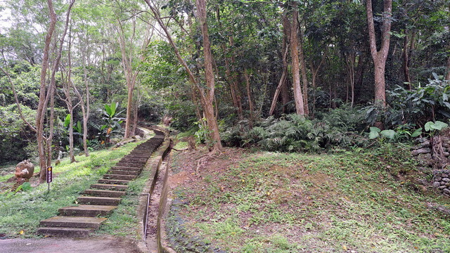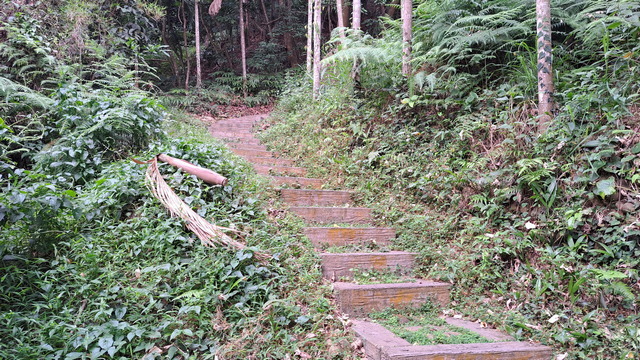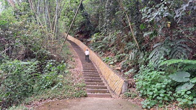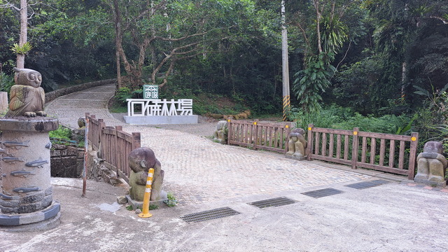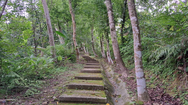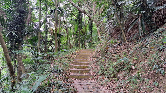 入口有些石雕裝置藝術,沿著修葺良好的寬敞步道進入山林。石磚、階梯鋪設良好,兩側灌木、樹叢、蕨類整理得亂中有序,這麼美麗的步道卻缺少了山風,悶熱的天氣令人窒息。走到「圓環口」後,才有空氣流動,身心舒暢。畢竟今天中北部下雨,嘉義也不至於萬里晴空。