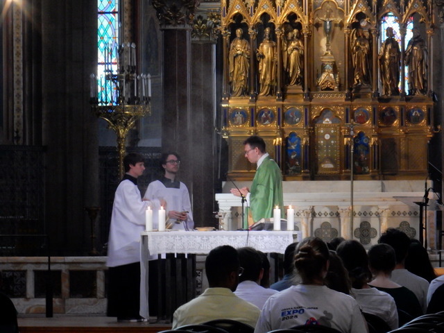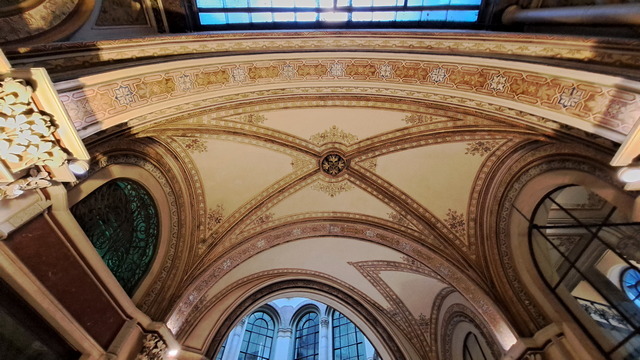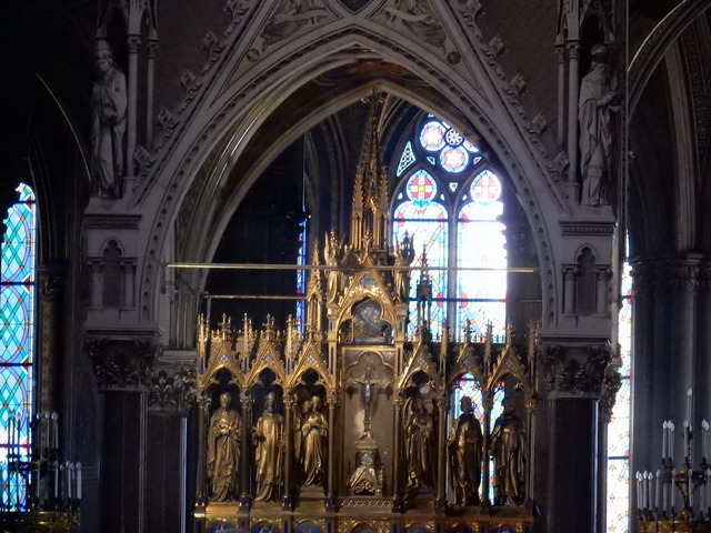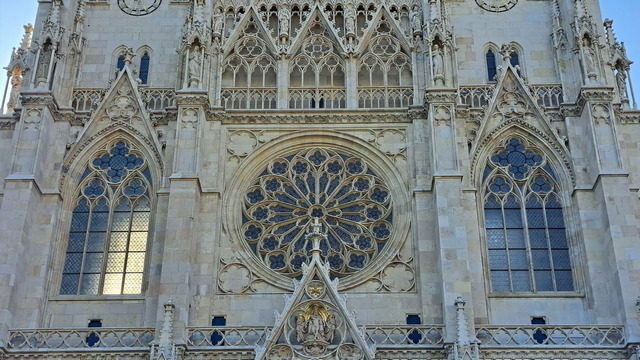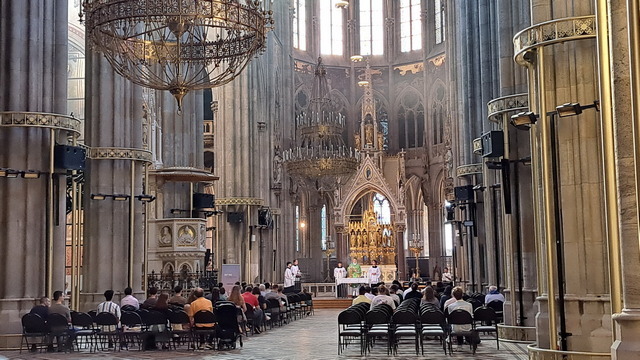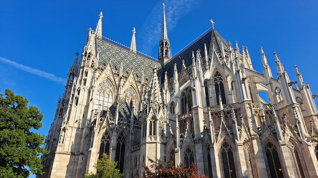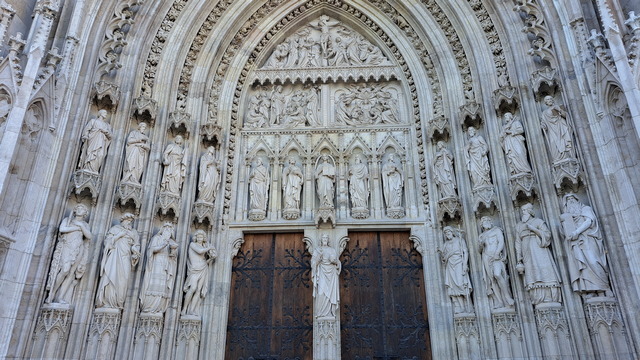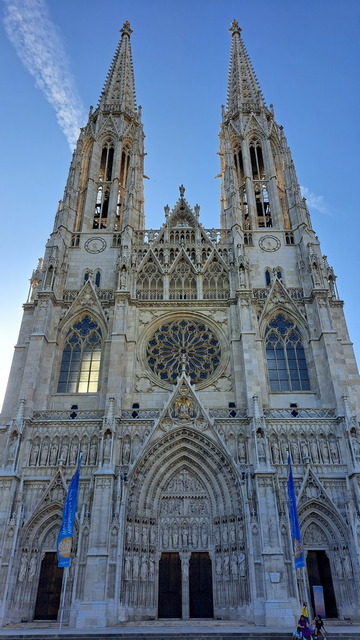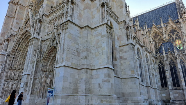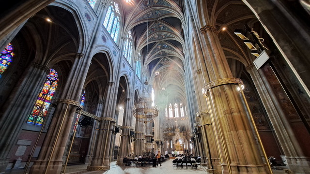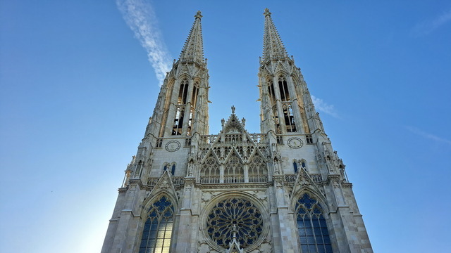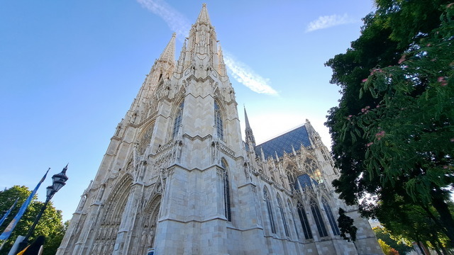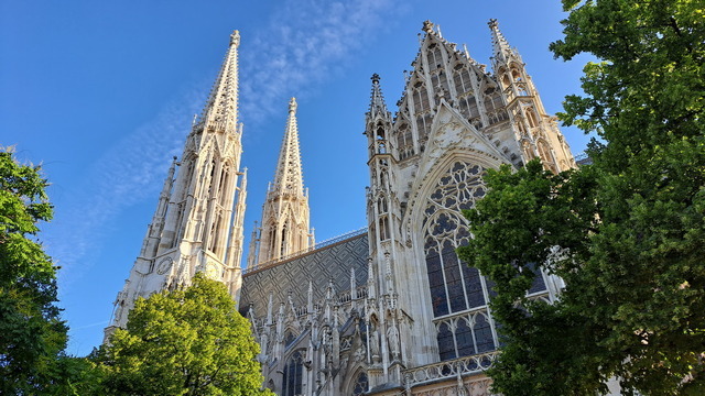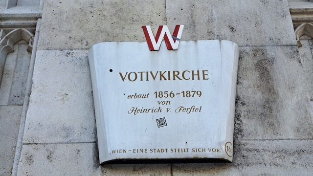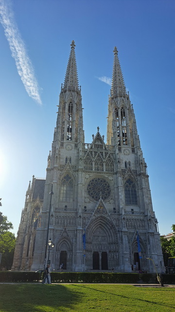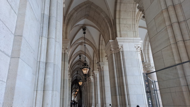 從維也納大學繼續往前走到路底,穿過馬路,就是感恩教堂,進入時正值彌撒進行中,氣氛莊嚴靜謐。這座教堂是為了感謝神明保佑皇帝法蘭茲‧約瑟夫一世在1853年暗殺未遂中倖存,由其兄馬克西米連(後來成為墨西哥皇帝)發起募款興建的。雙尖塔高99米,是維也納第二高教堂,僅次於史蒂芬大教堂,建築風格為新哥德式。我看表面貼磚平坦,工法比較新,也代表著19世紀對中世紀宗教精神的重新肯定。