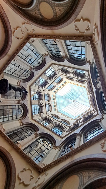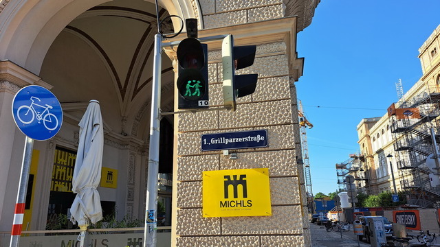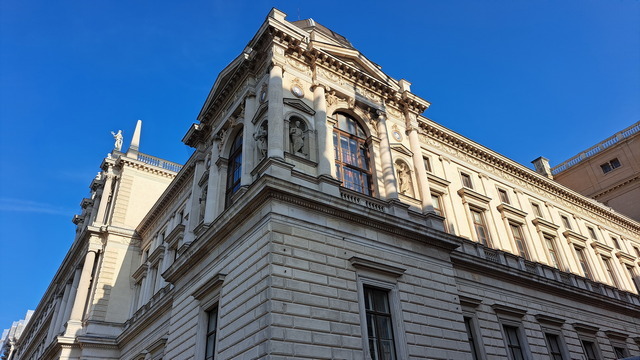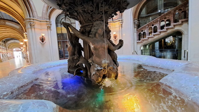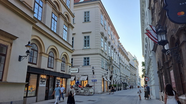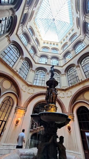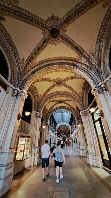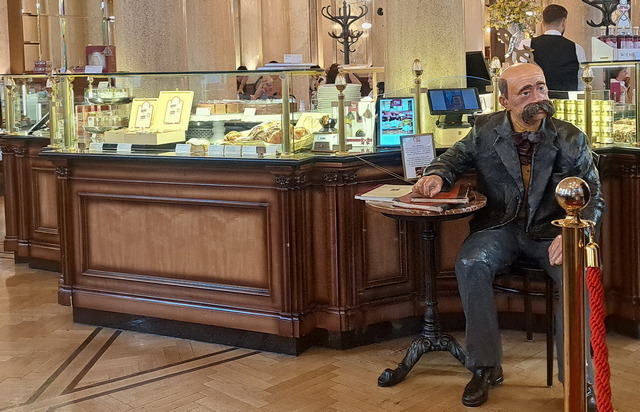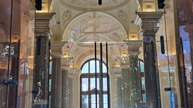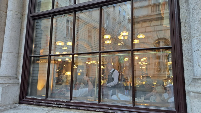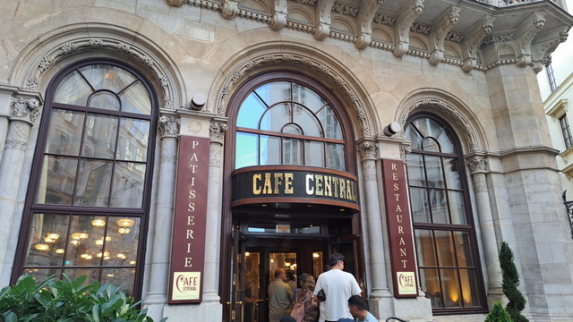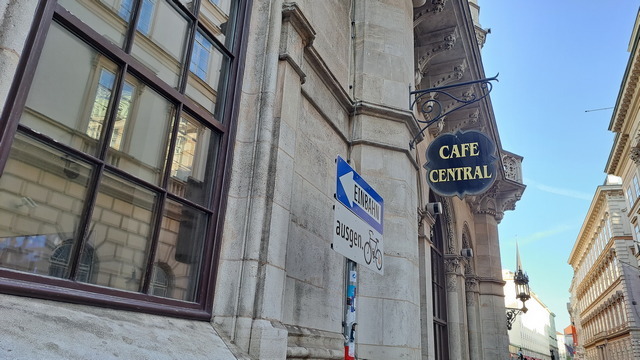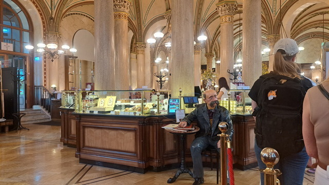 再往前走是費爾斯特宮(Palais Ferstel),建於 1856 至 1860 年間,原始用途是奧匈帝國國家銀行與證券交易所。這棟建築以設計者費爾斯特(Heinrich von Ferstel)命名,現在裡頭開滿精品店。1876 年起,著名的中央咖啡館(Café Central)也進駐其中,成為當時文人雅士與革命家的聚會場所,最有名的常客包括佛洛伊德,而門口那尊坐著的雕像則是作家艾騰貝格(Peter Altenberg)。他那句名言如今仍廣為流傳:「我不是在喝咖啡,就是在去喝咖啡的路上。」本來想看看有沒有機會進去坐,看見門口還有三到五組人馬在排隊,於是算了。歐洲有很多「最美的 ×××」,也不過爾爾。可能因為設在古典的建築物內,別有一番高級感。