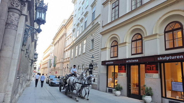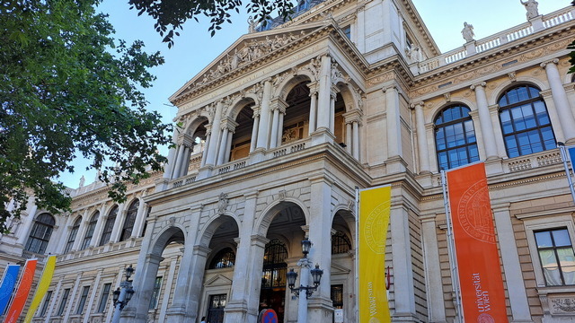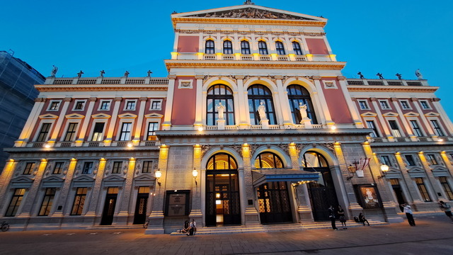 先走到「維也納音樂之友協會」(Musikverein),建於1812年,被譽為全世界音響效果最好的音樂廳之一,沒有任何現代電子音響輔助,但聲學效果完美,被形容為「聲音的黃金比例」。裡面共有六個音樂廳,最華麗的莫過於金色大廳,裝飾極為華麗,充滿金色元素,是全球古典音樂愛好者的朝聖地。每年維也納新年音樂會都會在此舉辦,也是維也納愛樂的常駐音樂廳。