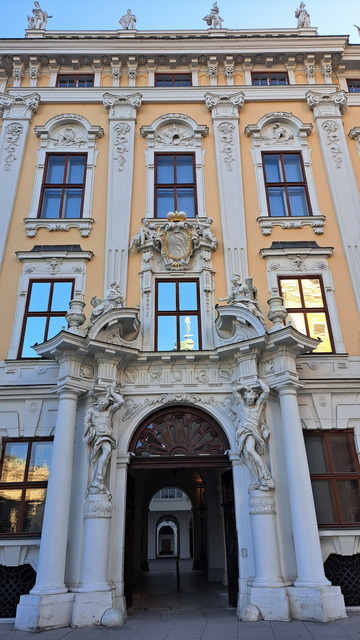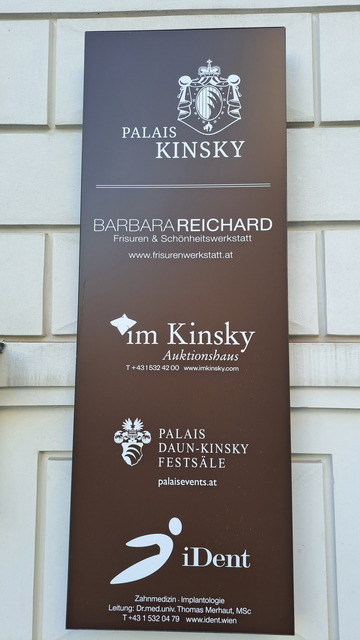 首先是金斯基宮,一座典型的奧地利巴洛克建築,哈布斯堡帝國將軍道恩伯爵於1713年至1719年間委託建築師Hildebrandt打造,曾做為阿根廷駐維也納大使館、戰後英佔的軍官會所等。1990 年代末整修後,如今成了婚禮、宴會與拍賣活動(如 im Kinsky)的場地。
