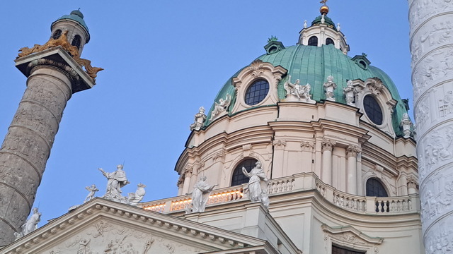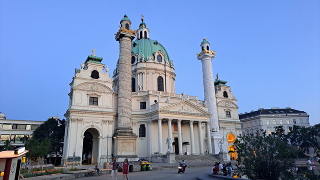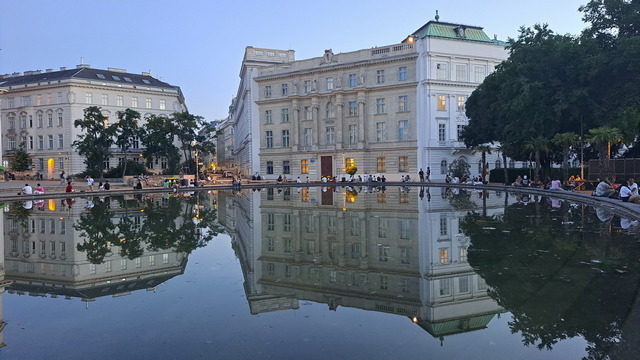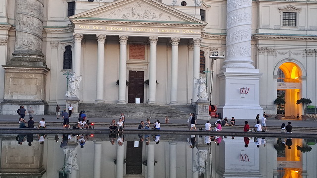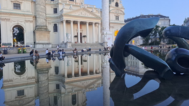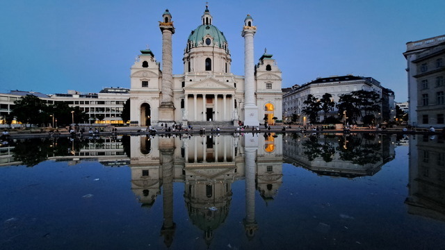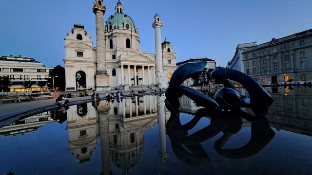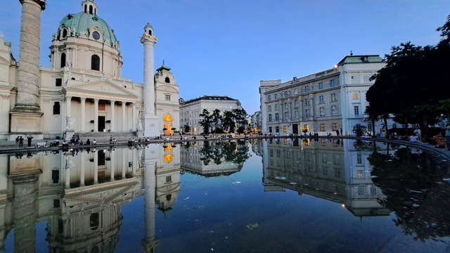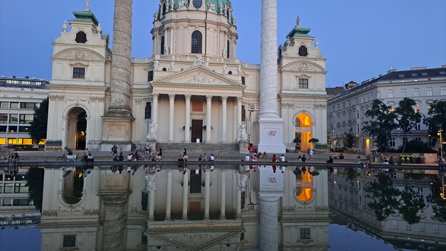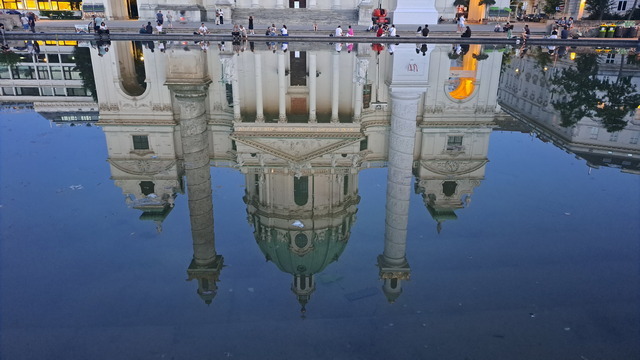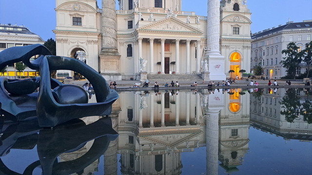 卡爾教堂是維也納最宏偉、最具代表性的巴洛克教堂之一,而我覺得最好的設計就是水池了,倒映教堂,顯得寧靜和平。但是水池中有一堆垃圾,各國都一樣吧。