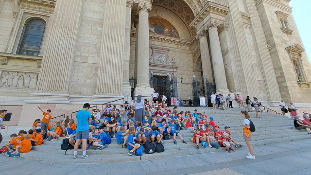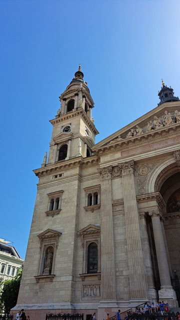 走到大教堂前,這座於1905年落成的建築,高達96公尺,是為紀念匈牙利第一位國王聖伊什特萬一世而建。8月20日的「國王日」也因此被訂為匈牙利最重要的國定假日。廣場上還有老師帶著學生參觀,可見這裡是匈牙利人歷史教育的必修現場。