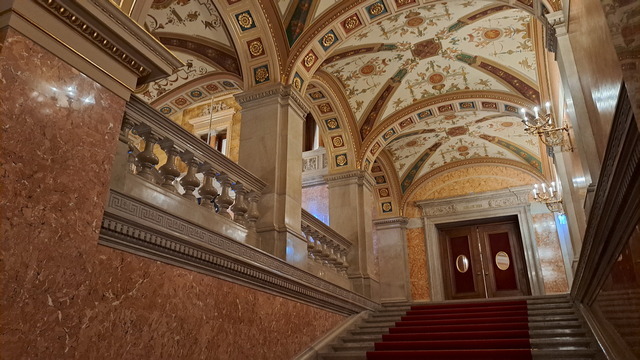 可惜今天市政府沒有開放參觀。莉莉說平常其實經常會對外開放。現任布達佩斯市長柯若瓊(Gergely Karacsony)是匈牙利反對黨的一哥,匈牙利是多黨制,而他代表幾個反對黨的聯合陣線出來競選,已經連任第二任首都市長了,深受市民愛戴。匈牙利奧爾班政權能贏得全國選舉,係以地方包圍中央的策略,以驚悚口號煽動鄉村選民;但是布達佩斯選民大多數支持柯若瓊,討厭奧爾班,冀望柯若瓊能贏得下次總統大選