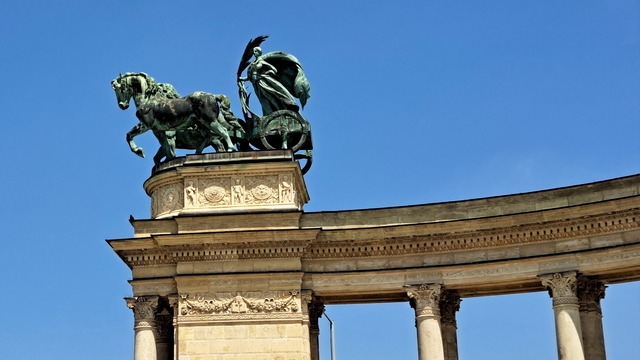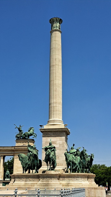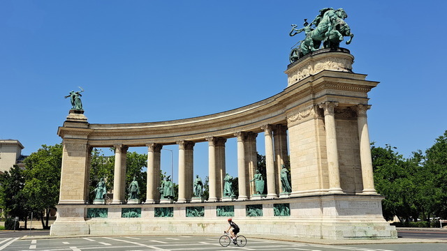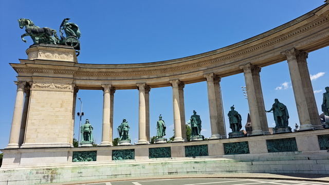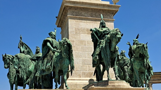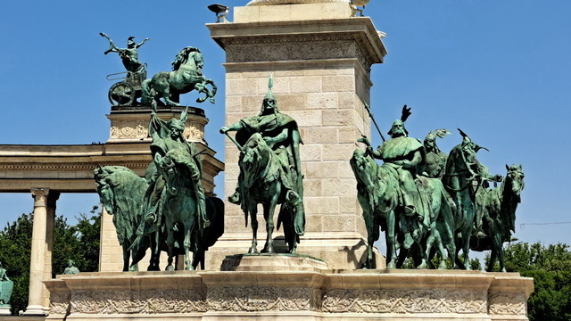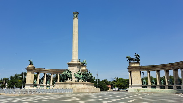 英雄廣場位於城市公園(Városliget)入口,展現出另一種感受的壯闊。落成於1896 年,慶祝匈牙利建國 1000 週年。正前方矗立著千年紀念碑(Millennium Monument),36 公尺高的石柱上原本有一尊手持匈牙利王冠與使徒十字架的大天使加百列雕像,不過天使已經飛走了。傳說中,加百列託夢給聖伊什特萬,指示他加冕為國王並將匈牙利皈依教化。下方則是七大部族領袖,正中央的是匈牙利民族之父阿爾帕德(Árpád)。馬札爾原先是東歐大草原的遊牧民族,西元896年,阿爾帕德率領馬札爾七大部族征服喀爾巴阡盆地,在此定居立國。後方是半圓形柱廊雕像,14位歷代重要領袖分排於左右兩側,左側第一位是匈牙利第一位國王伊什特萬一世。匈牙利民族之父——阿爾帕德(Árpád)匈牙利犧牲的無名英雄而立。廣場兩側分別是美術館和藝術廳。