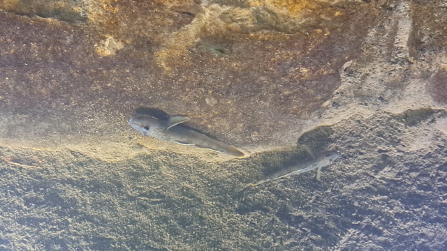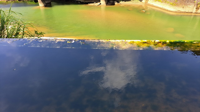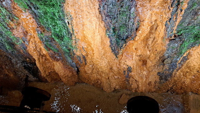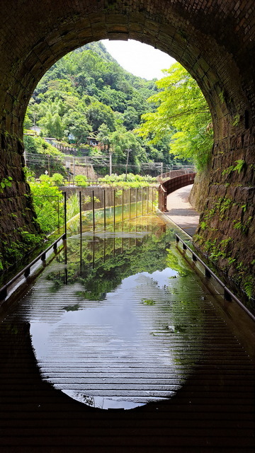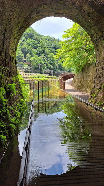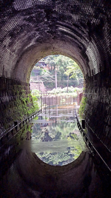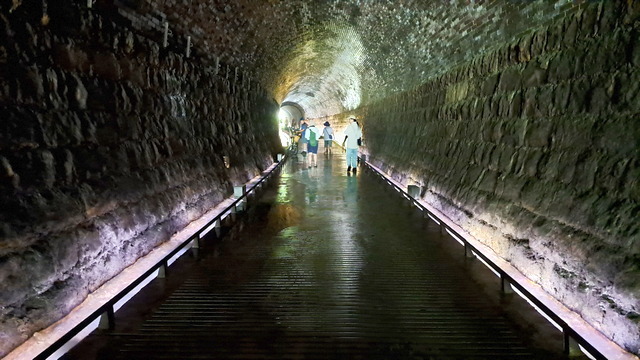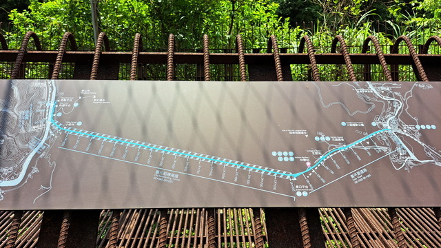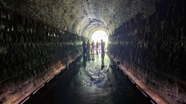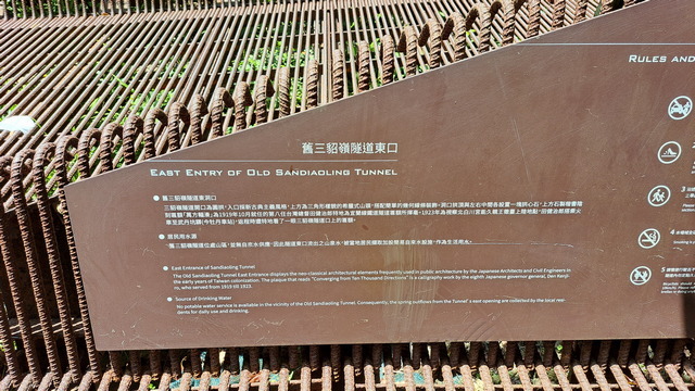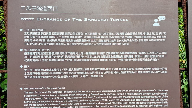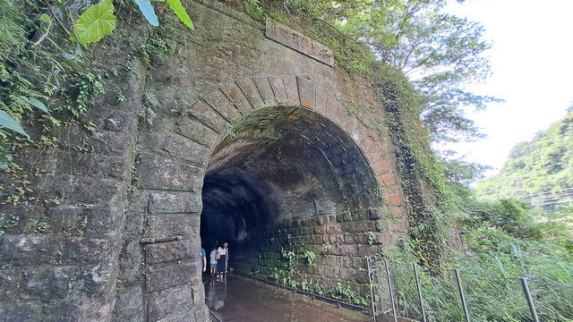 我們由西洞口進入,首先經過的是短短的「三瓜子隧道」,入口上方刻著當年台灣總督明石元二郎的草書題字「至誠動天地」,訴說著當年開鑿隧道的艱辛不易。入口處長年積水,許多遊客會在此拍攝水中倒影;這裡的積水從兩側排水溝渠溢滿,清澈的山泉水裡可見小魚悠游、溪蝦虎吸附在岩石上,讓人不禁想:難道這是當年基隆河曾淹上來的證據嗎?