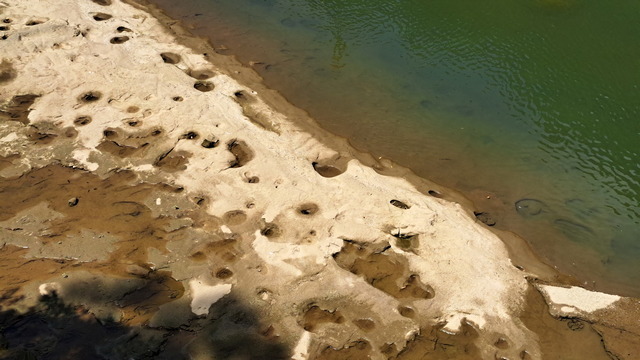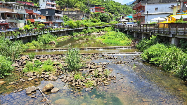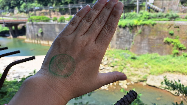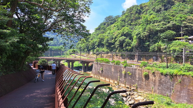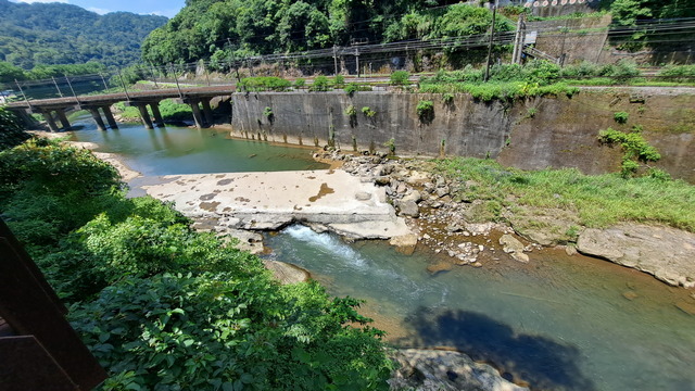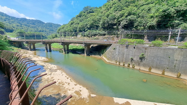 我們在入口處掃描預約的 QR Code,手背蓋上綠色章後,便沿著基隆河畔前行。河床間散落著獨特的壺穴景觀,對岸就是三貂嶺車站,平溪線與宜蘭線在此分道揚鑣。一條鐵道沿著基隆河右岸通往平溪,另一條則跨河開往宜蘭,下一站就是牡丹車站。這條擁有百年歷史的老隧道,在台灣鐵路電氣化後,因無法架設電線且滲水嚴重而廢棄,被新闢的隧道所取代。