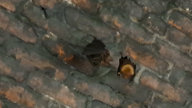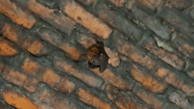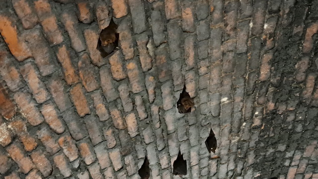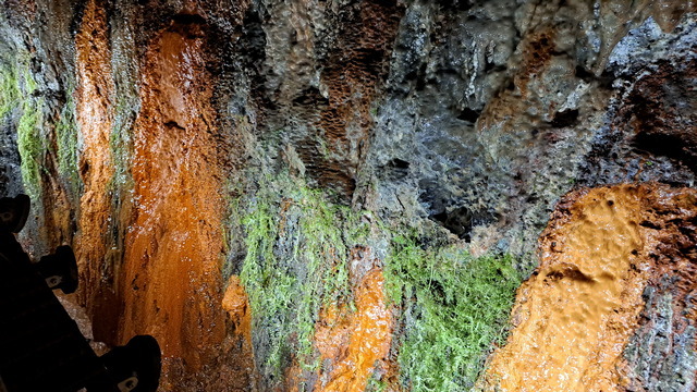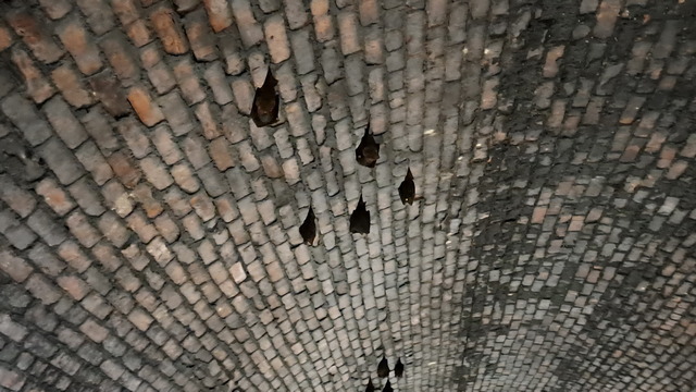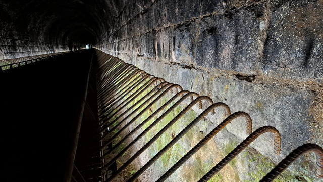 接著走進漫長的舊三貂嶺隧道,簡單的燈光從兩側的溝渠投射出來,映照出隧道岩壁上夢幻的七彩。走進隧道不久,就會遇到一位管理員駐點,這裡幾公尺內是台灣大蹄鼻蝠的棲息範圍。蝙蝠三三兩兩吊掛在隧道頂部睡覺,我的手機鏡頭一對準,可以發現蝙蝠也盯著我看。這段黑暗而涼爽的「時空暗線」中,不曉得蝙蝠如何能有時間感?因為國外有實驗,把人丟到黑暗洞中,擾亂他們的日夜感覺。有點好笑的是,遊客都靜靜地觀察蝙蝠,只剩管理員指揮的聲音。