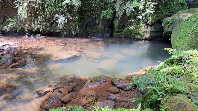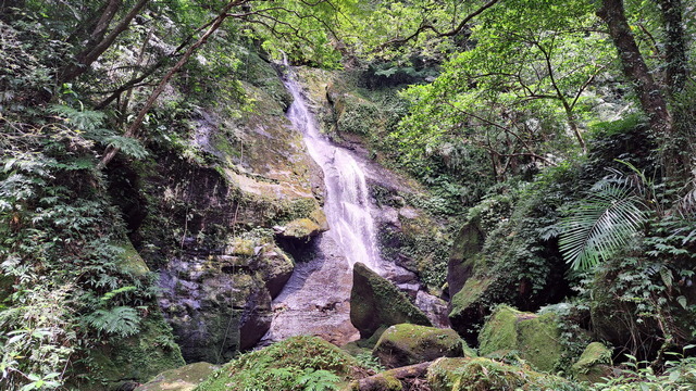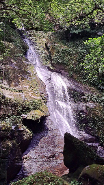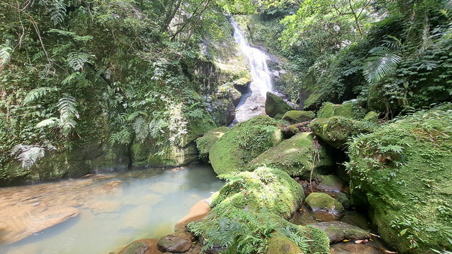 夢幻瀑布深藏於蒼翠的山谷之間,清澈的水流自高處傾瀉而下,銀白長絹拍打在嶙峋的岩壁而洩入潭面,水聲轟鳴,不絕於耳,涼意沁入心脾,只有水潭中肥碩的馬口魚陪伴著我們,獨享這份遺世獨立的夢幻之美。
