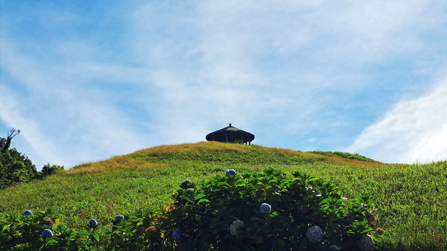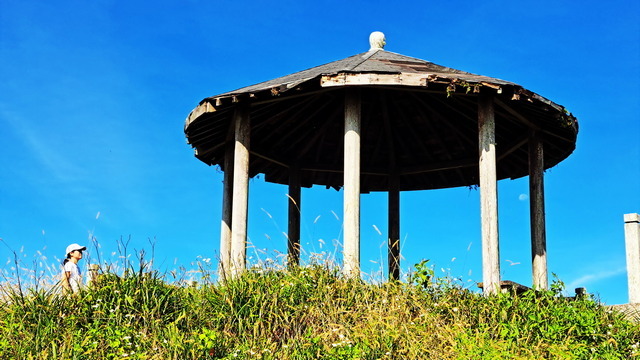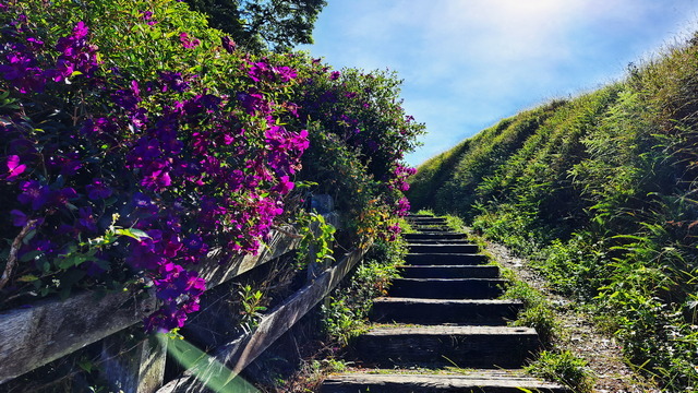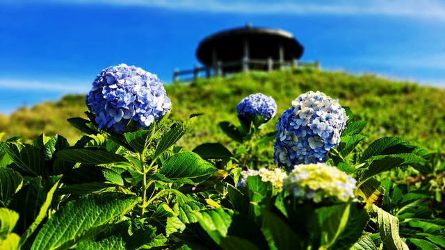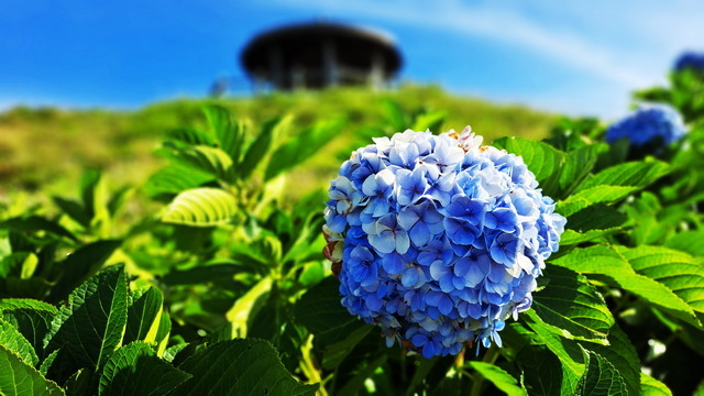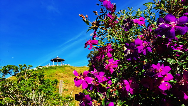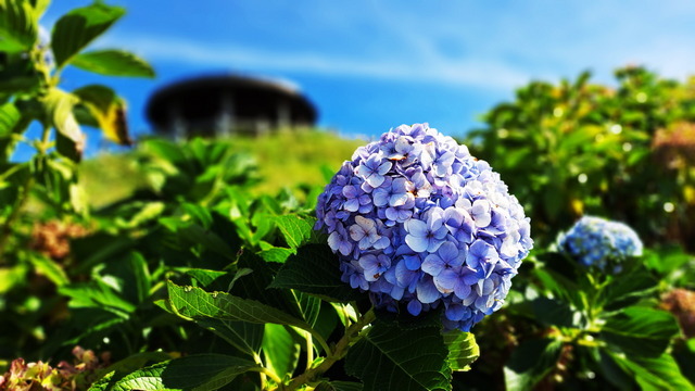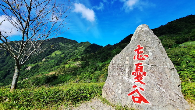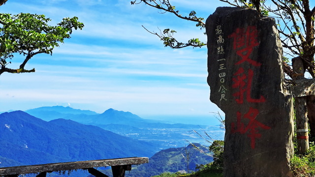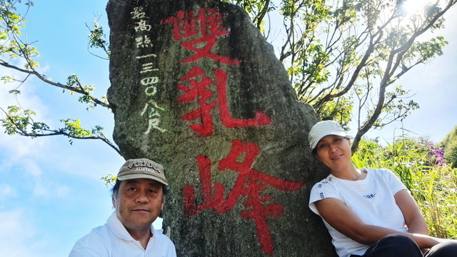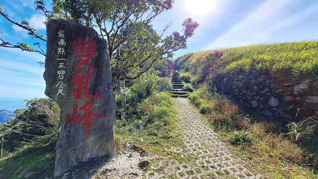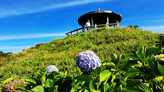 道路的終點是忘憂谷。這裡規劃了環形登山路線,設計上是「左去右回」,不過導航卻指示我「右去左回」。順時針上山的路徑確實比較陡峻難走。到了山頂,有一塊大碑石寫著「雙乳峰」,旁邊植滿繡球花。不知道為什麼,總是有人愛取這種名字吸引遊客;不過,這裡的確是有兩個突出的小山丘,山丘上面各建造一座涼亭,這樣一解釋就懂了。