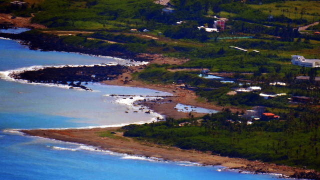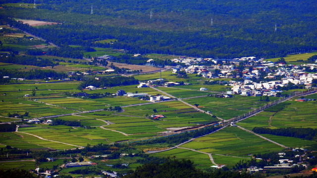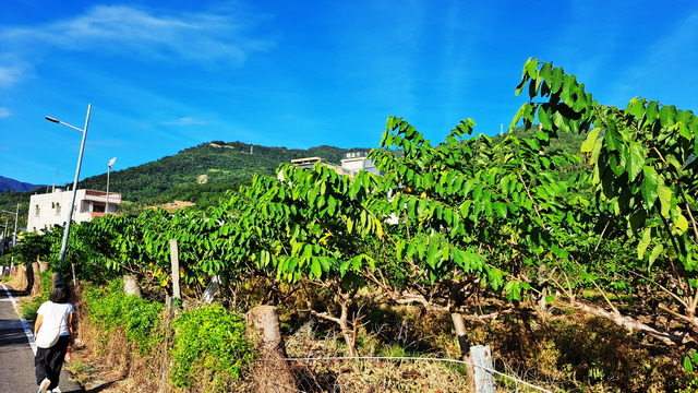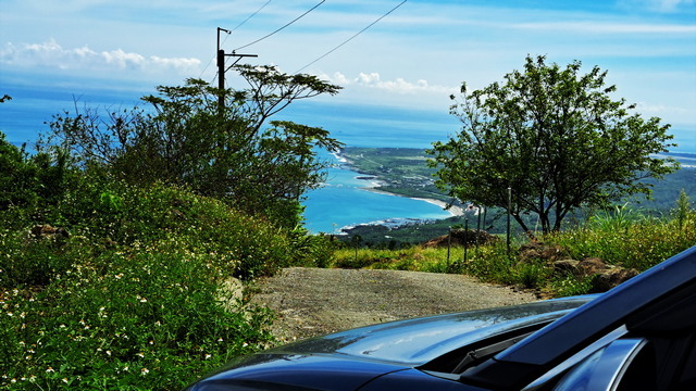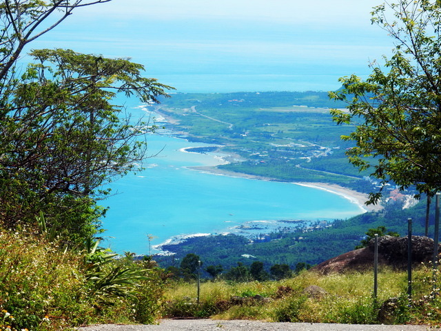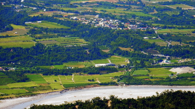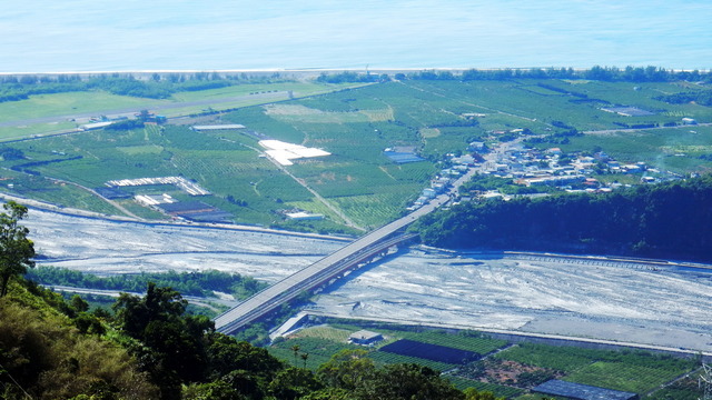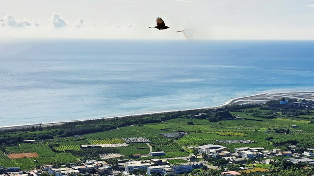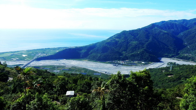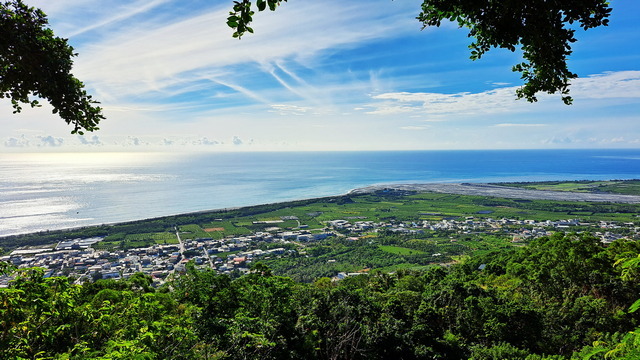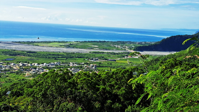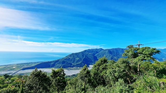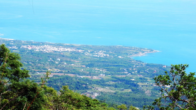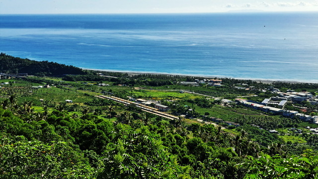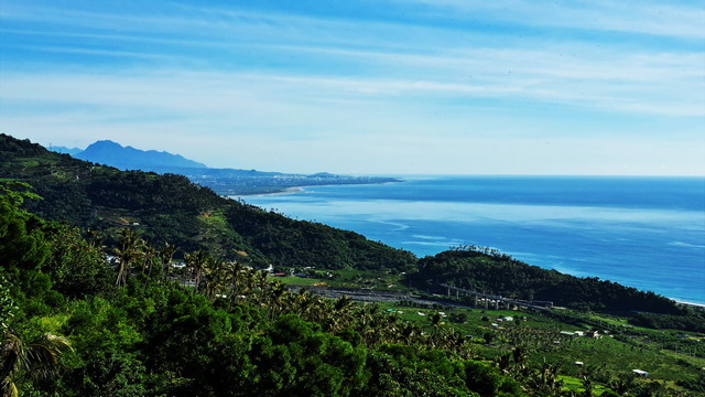 沿著佳崙產業道路一路驅車而上,回頭望去即可盡覽美麗的東海岸線。今天晴空萬里,「臺東藍」格外漂亮,耀眼的光芒從海面反射,腳下的太麻里溪沖積平原和蜿蜒的海岸線清晰可見。