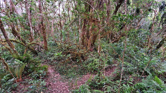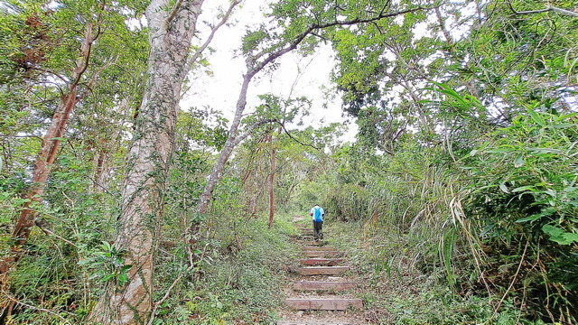 今天來爬都蘭山的人潮出乎意料地多,特別是那些搭乘遊覽車的遊客,大多裝備簡便。有些人直接在觀景台閒聊,有些人三三兩兩地下山,不知他們究竟走了多遠。這些以中老年人為主的團客,讓我感到旅行社的行程安排實在有些不妥。都蘭山步道全程3.8公里至三角點,儘管路況良好,但沿途不斷的上坡與下坡,並不算是一般輕鬆的郊山,我覺得其難度頗似谷關七雄。