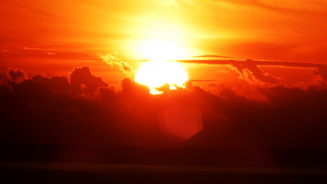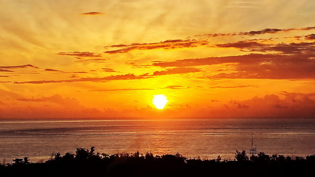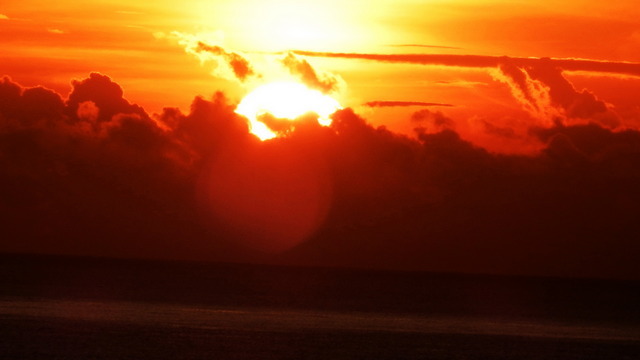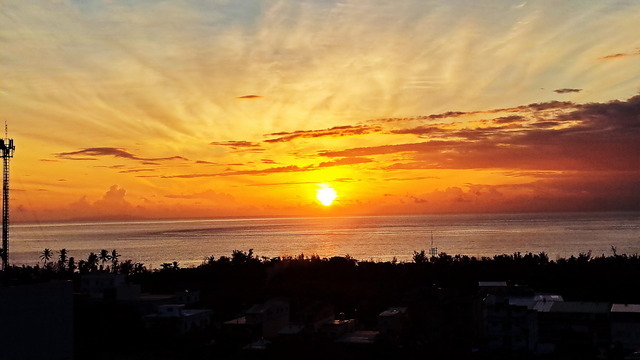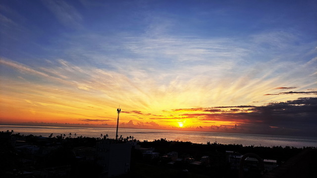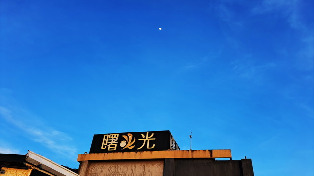 可惜今天清晨有烏雲,太陽並未從海平面「蹦」出來,而是從雲間探出頭來,有一種很阿Q的名詞稱為「雲間日出」,這樣也算看到日出。雖未見到海平線的磅礴,但雲層為光線增添了層次感。轉身準備下樓時,皎潔的月亮仍奮力對抗著冉冉上升的紅日,呈現出「日月同輝」的奇景。