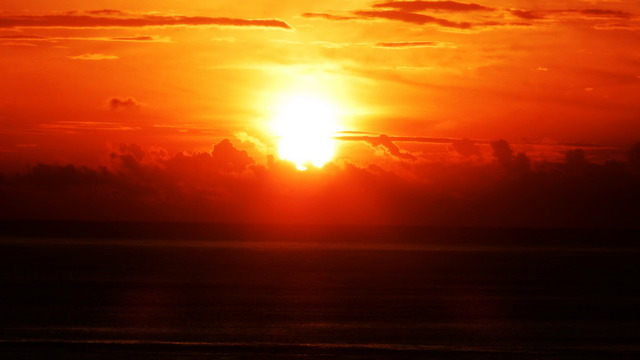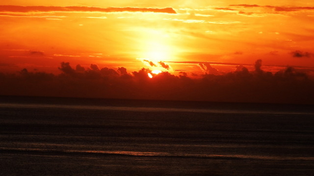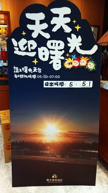 前一晚在旅館辦理入住手續時,櫃台旁告示板寫著隔天日出時間 5 點 51 分。五分鐘前起床,臨時起意就衝上旅館頂樓看日出,當作今天是元旦。雖然匆匆忙忙,但上了頂樓剛好達陣,已經有十幾位住客翹首盼望。