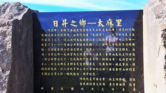 排灣族祖先越過大武山來到此地,看見曙光自海面升起,驚呼「大貓貍」,也就是「太陽升起」,於是發音演化成「太麻里」。2000 年時全球瘋日出,公視曾和BBC連線轉播為千禧年迎曙光。我今日造訪此地,捨不得放過每一個視角,由衷覺得這裡是全國最美麗的小百岳三角點。