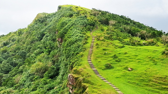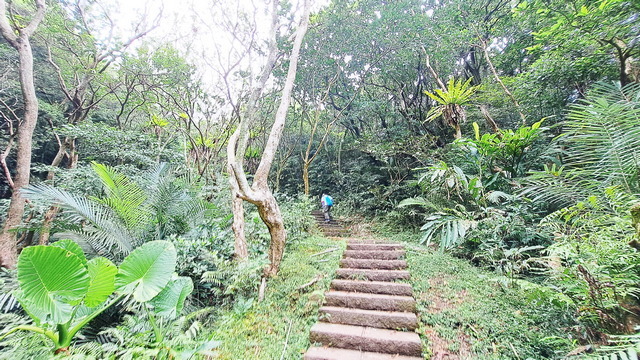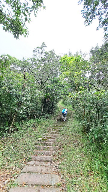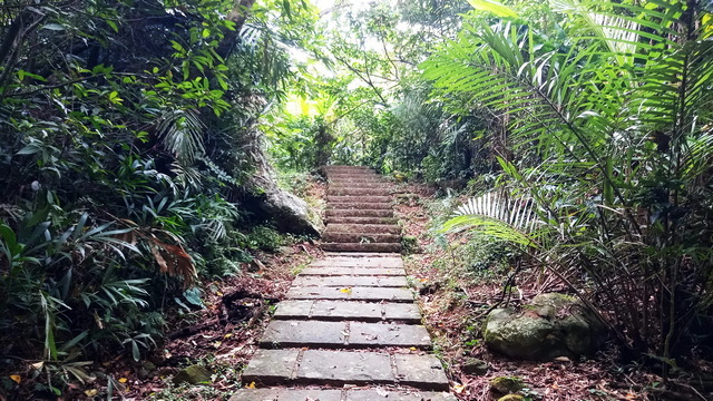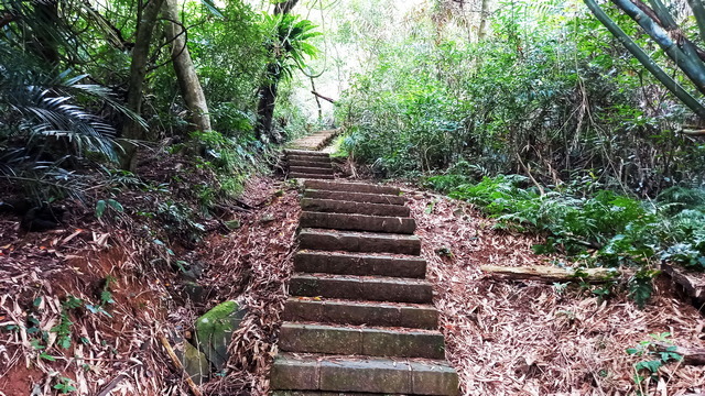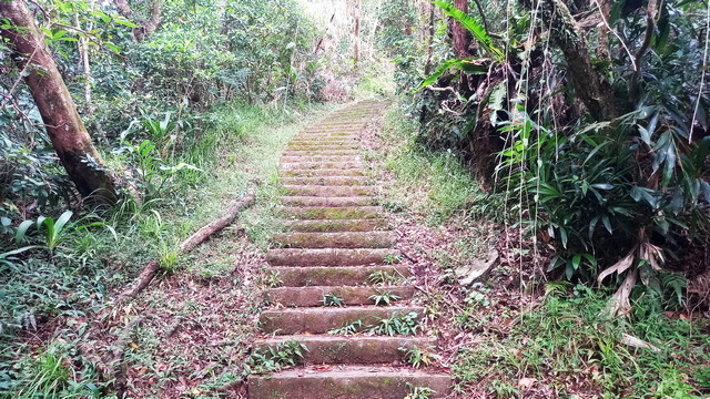 清晨出發,趁著車潮湧入前穿過雪山隧道,順路在頭城買福興大飯糰。抵達大溪河濱公園的停車場,這裡便是步道的起點。一條完整的階梯步道,蜿蜒穿梭在濃密的叢林之中。雖然沿途設置了石桌石椅供人歇息,但恐怕不會有人在這無聊的叢林內坐下吧?有體力的人都直接上山,沒體力的人早就打退堂鼓。可惜的是,公共廁所因缺水而內部髒臭不堪,讓人唯恐避之不及。