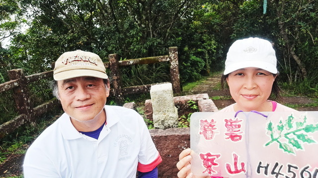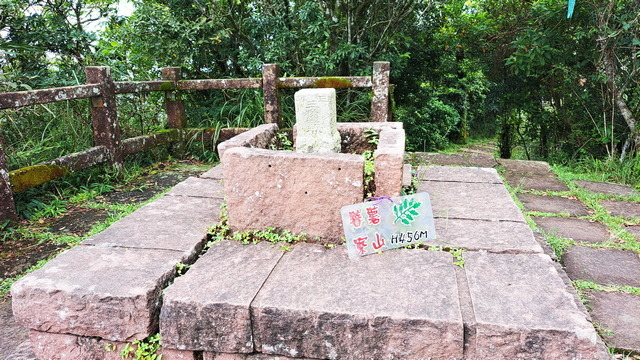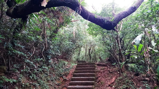 大約一個小時的掙扎,抵達了蕃薯寮山三角點,短短一小時內,爬升了約456公尺的高度。從這裡繼續向前,石階依舊,但被青苔長年侵蝕,使石板變得極為濕滑,讓人不得不避開階梯,改走旁邊的泥土路。這段路也應驗了登山客經驗之談:「千萬不要從大溪端下山」。