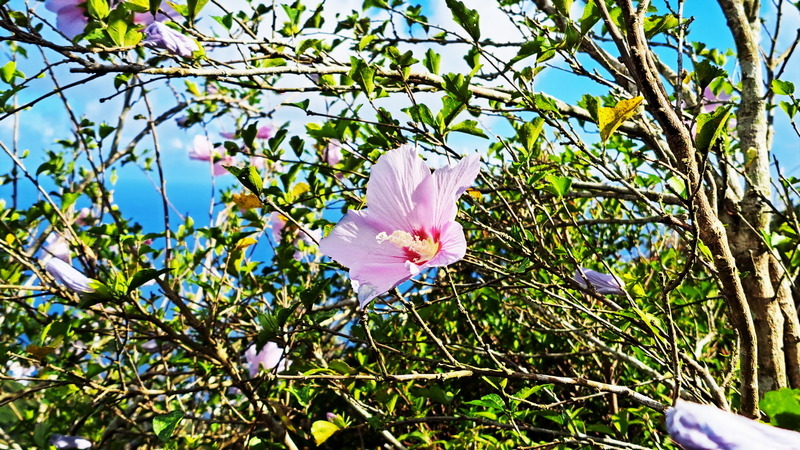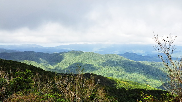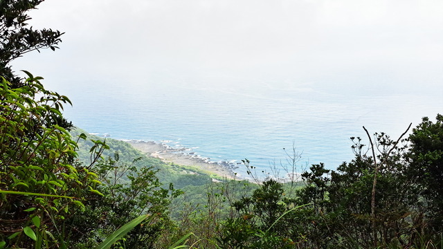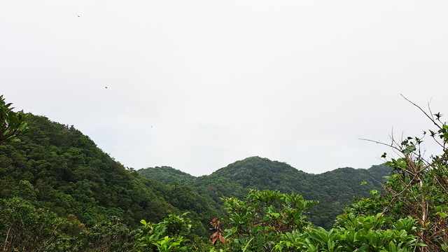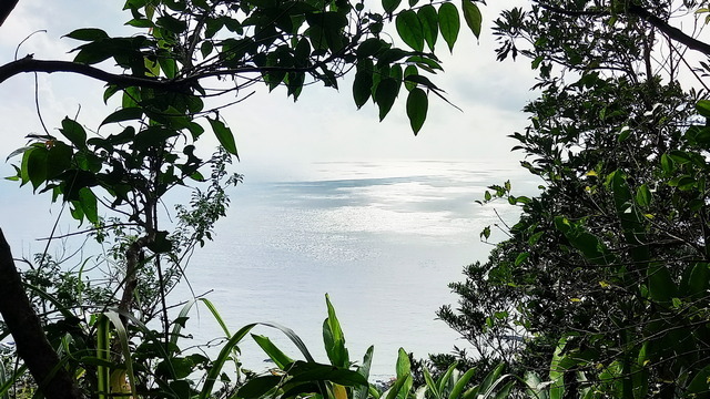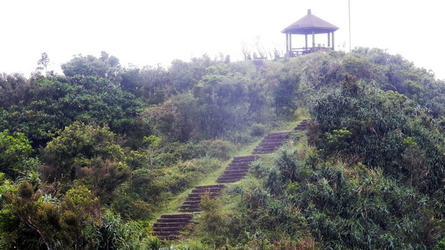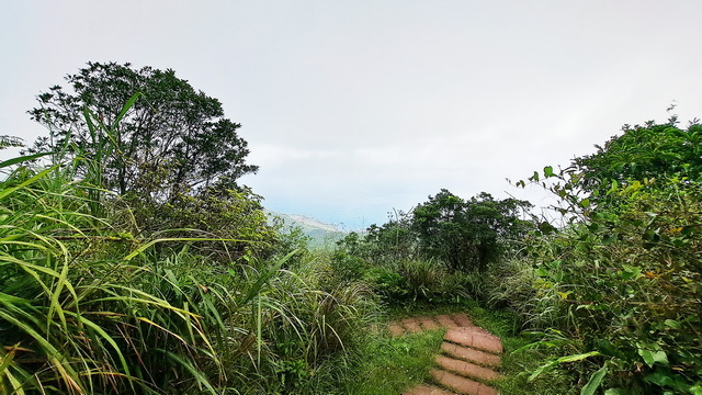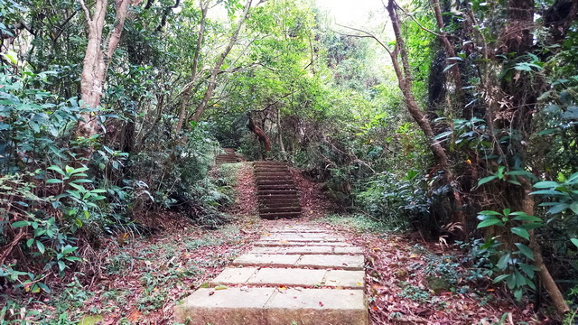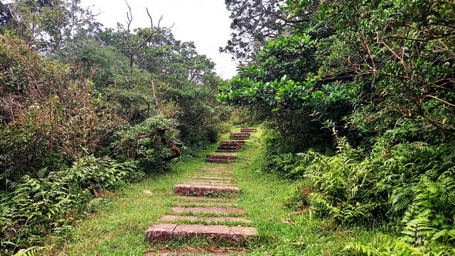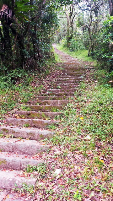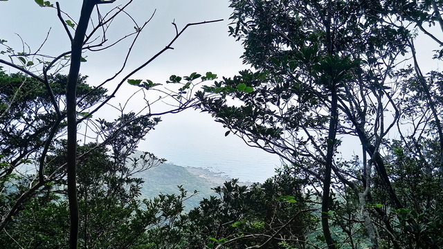 凌晨似乎剛下過一場小雨,天空仍陰雲密布,地面帶著微微的濕氣。上山不久,回首便可見大海。然而碧波萬頃的海面卻是死白一色。連續的中陡石階對體力是個連續折磨,「不陡」讓人馬不停蹄,「不緩」卻讓人不得喘息,我似乎犯了強迫症,只能麻木地一步步前進。