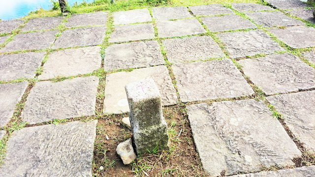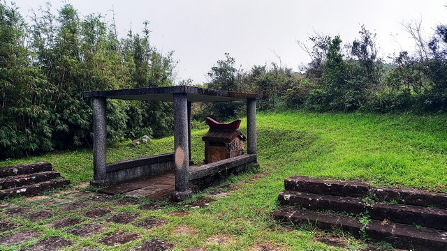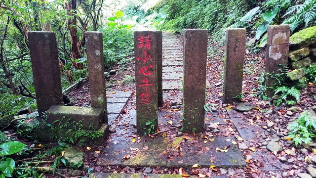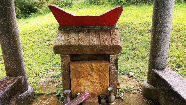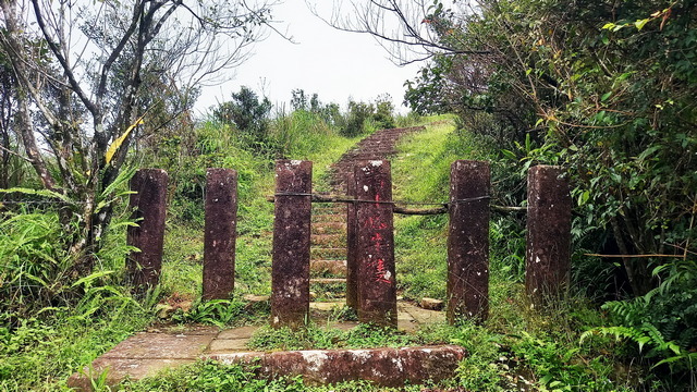 繼續前進,始見牛樁防止山上放養水牛進出,表示著即將登上高坡,土地公廟是高坡的起點,廟門已被石板封住,可能已將神尊請走。