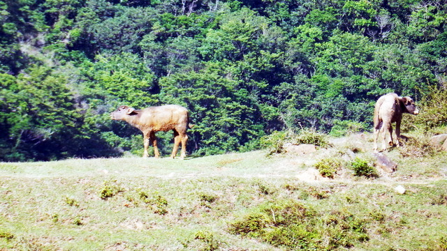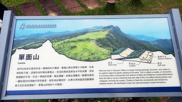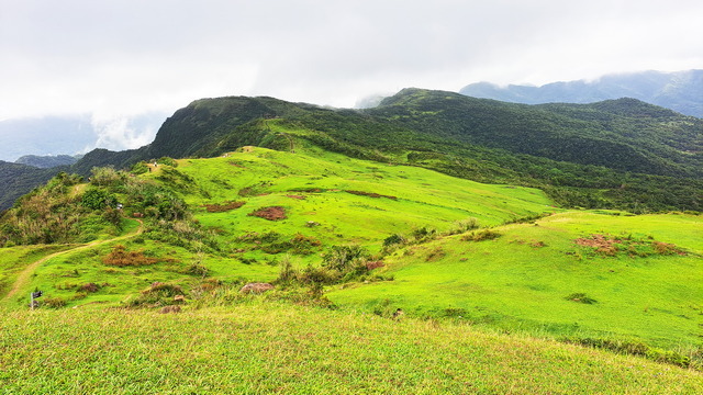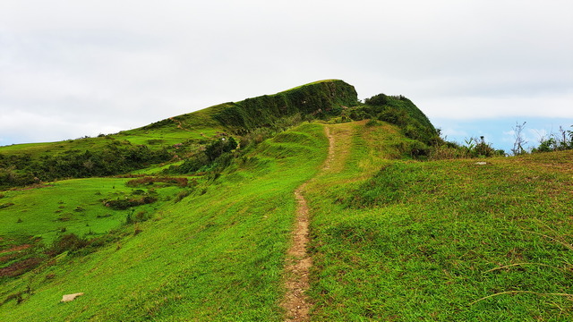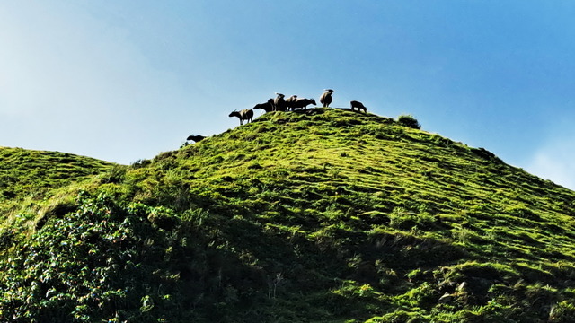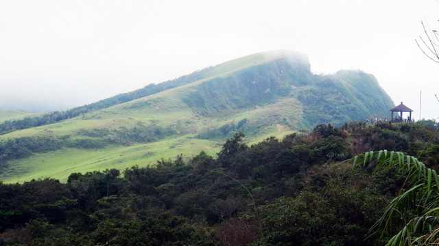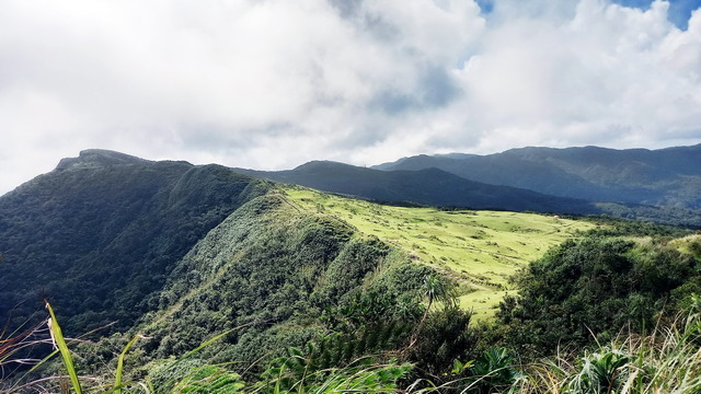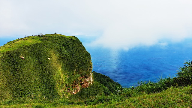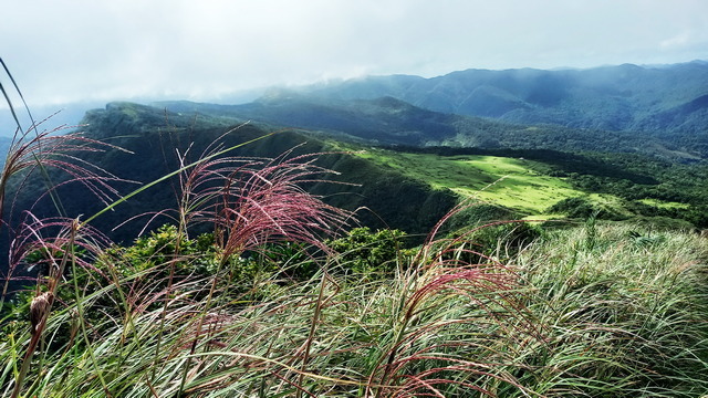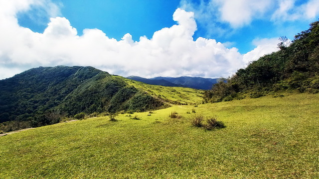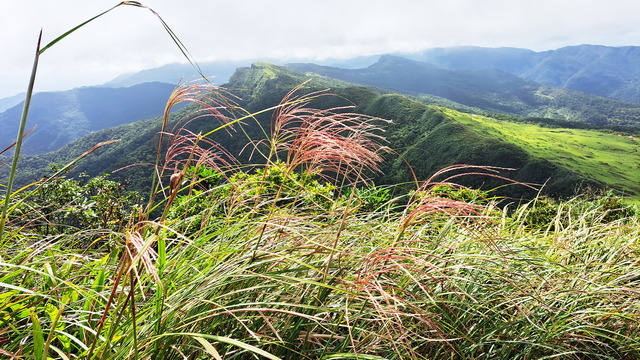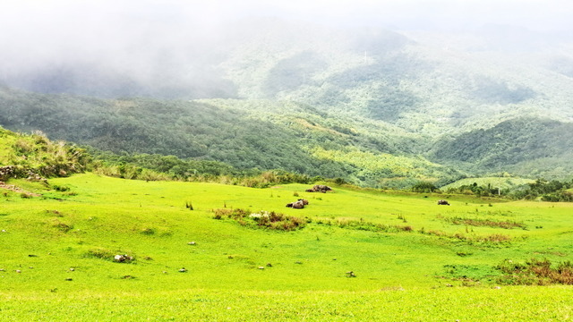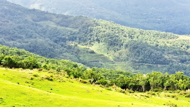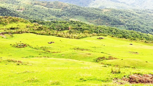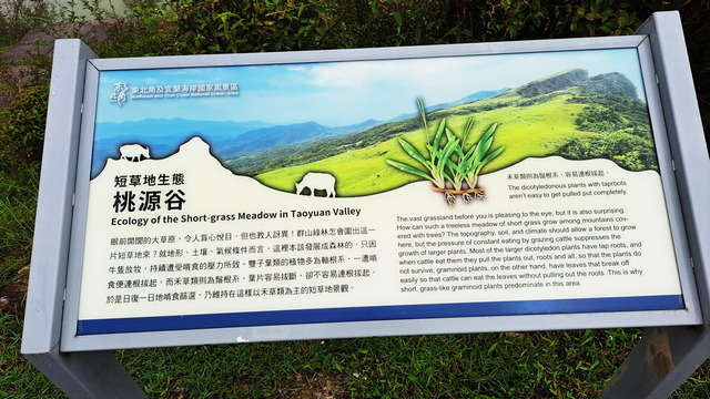 桃源谷的美景展開在眼前。前方有座「單面山」,其實這條步道處處都是「單面山」,內側坡度平緩,外側坡度極為陡峭,形成山稜線大草原,可欣賞山海景的無敵交會。這一帶早期曾被稱為「大牛埔」或「綑牛仔山」,原本應是茂密的森林,但經年累月被放養的牛群啃食,樹根因較淺而慘遭連根拔起而「斷子絕孫」,唯有草根深紮得以倖存,從而造就了壯麗的青青草原。去年底曾發生水牛傷人事件,讓部分牛柵欄纏繞了鐵絲網,人群和牛群也被遠遠地隔離,讓人感到心痛不捨。
