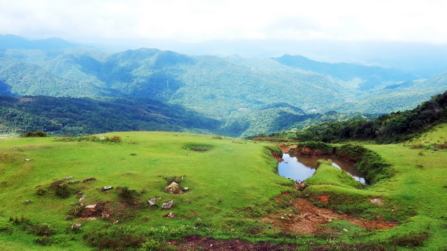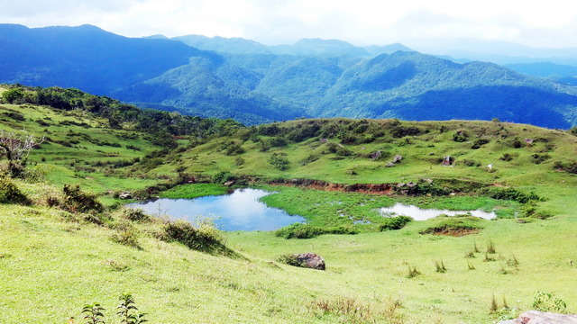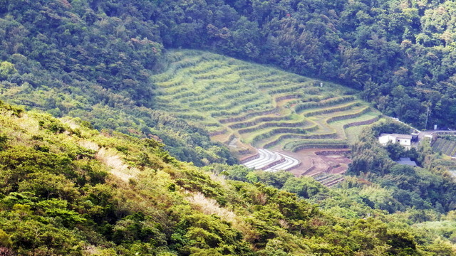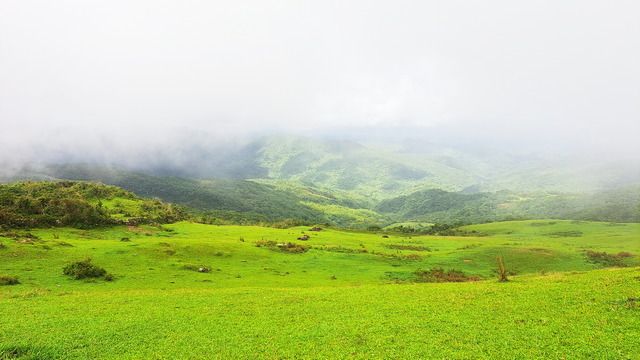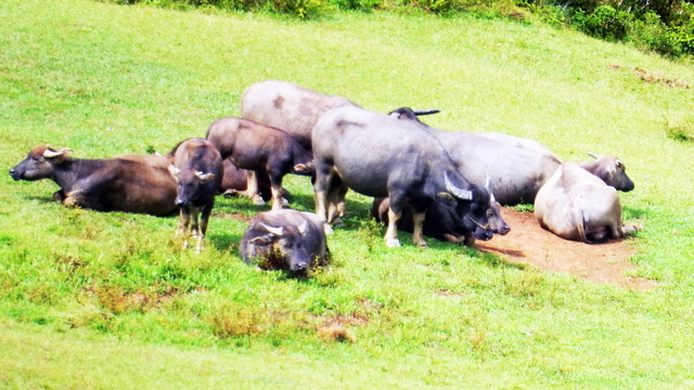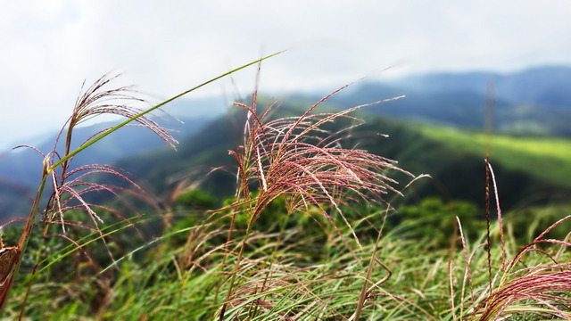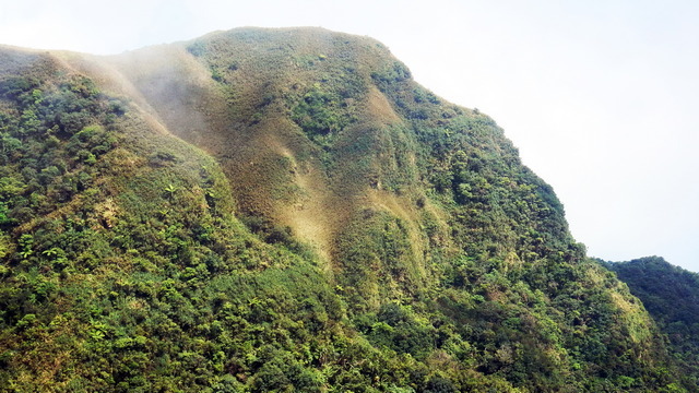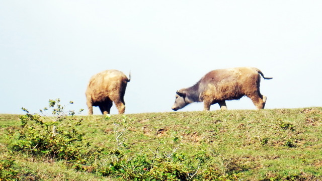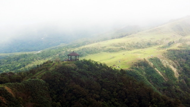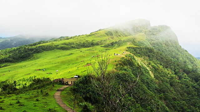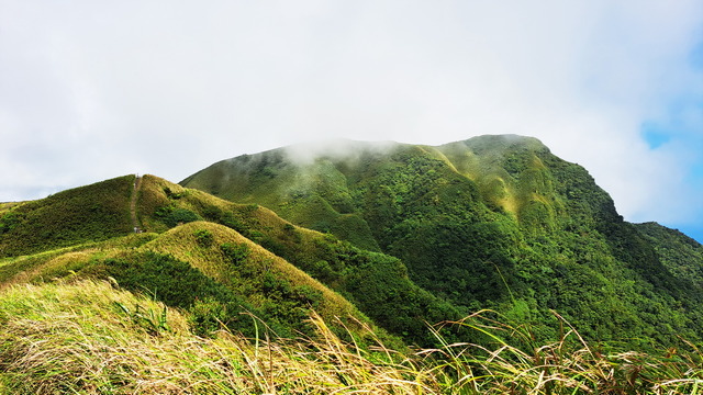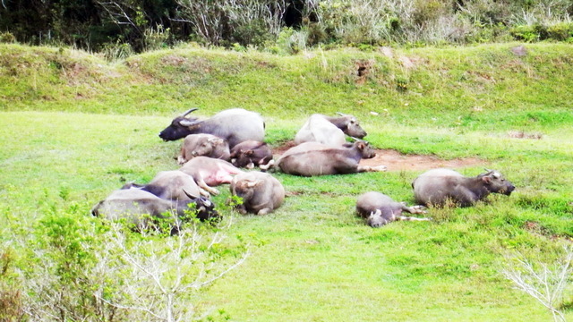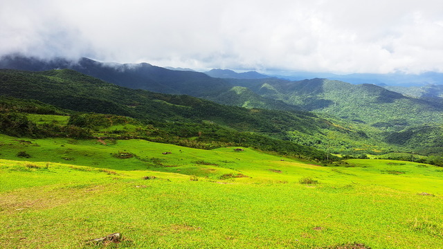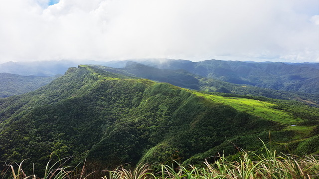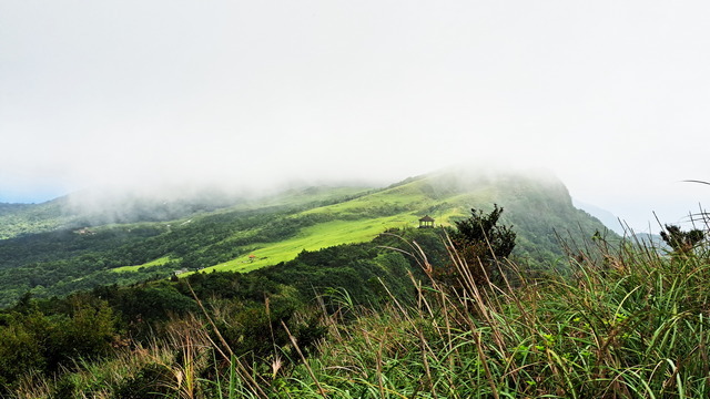 桃源谷的美景展開在眼前。前方有座「單面山」,其實這條步道處處都是「單面山」,內側坡度平緩,外側坡度極為陡峭,形成山稜線大草原,可欣賞山海景的無敵交會。這一帶早期曾被稱為「大牛埔」或「綑牛仔山」,原本應是茂密的森林,但經年累月被放養的牛群啃食,樹根因較淺而慘遭連根拔起而「斷子絕孫」,唯有草根深紮得以倖存,從而造就了壯麗的青青草原。去年底曾發生水牛傷人事件,讓部分牛柵欄纏繞了鐵絲網,人群和牛群也被遠遠地隔離,讓人感到心痛不捨。