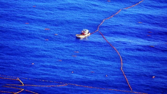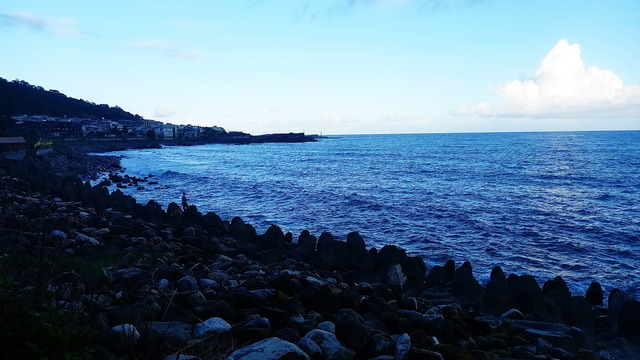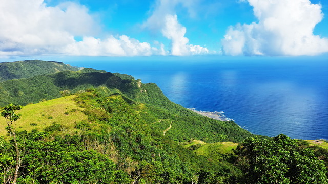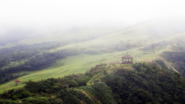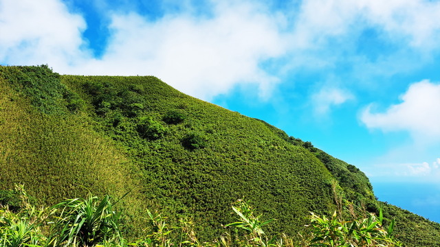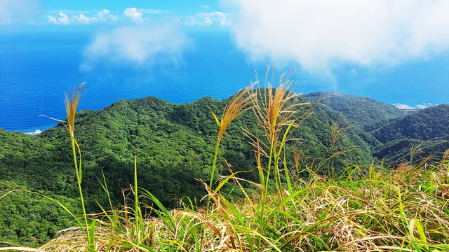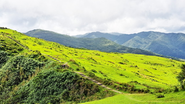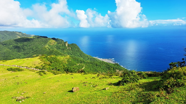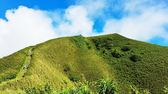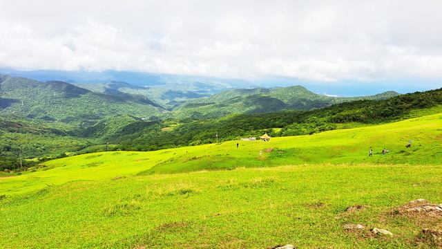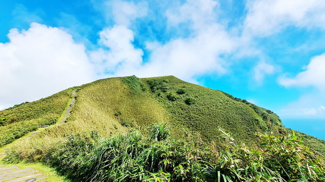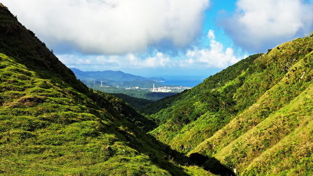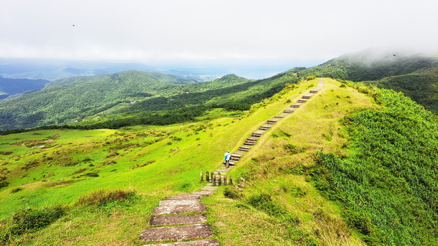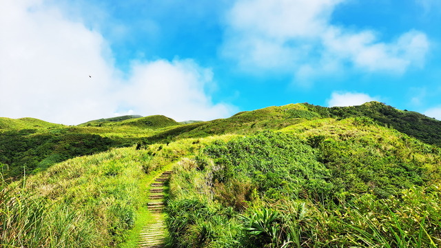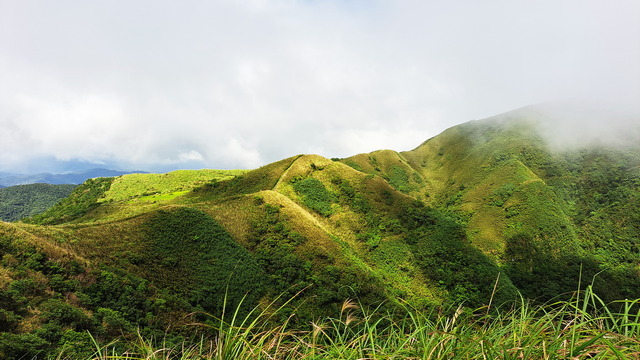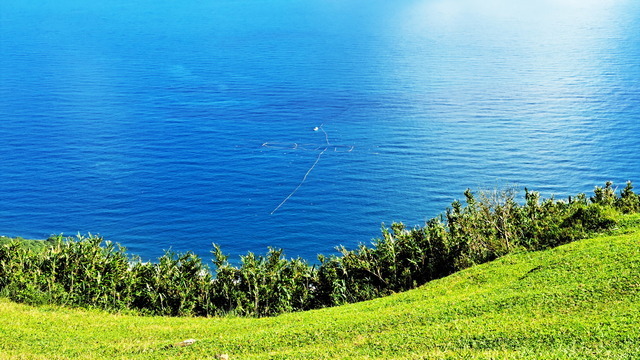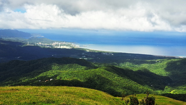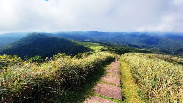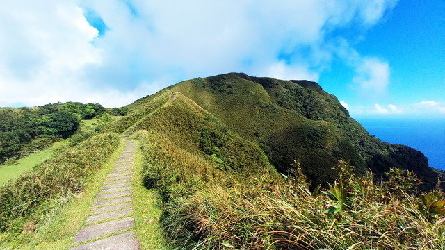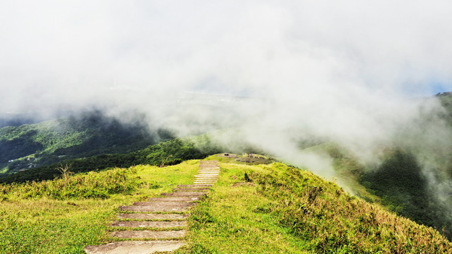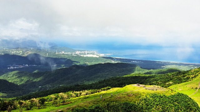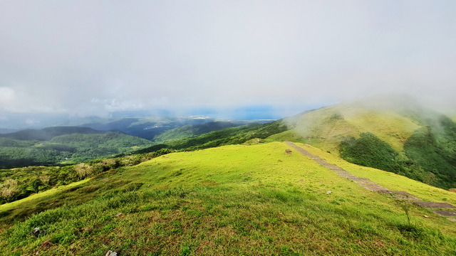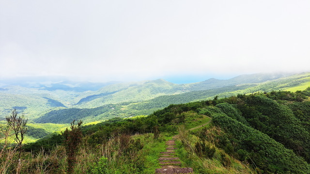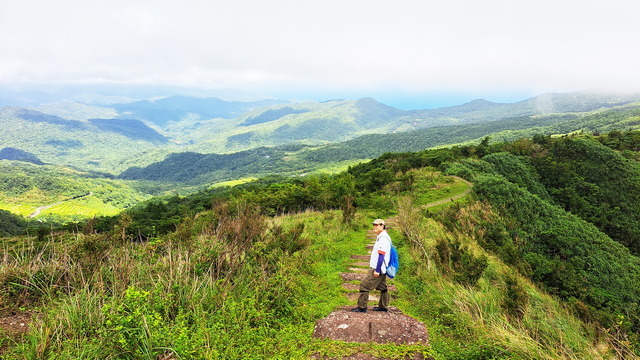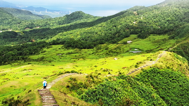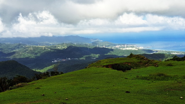 接下來的幾個小時,我們沿著稜線漫步,走過石觀音步道口,烏雲終於散去,湛藍的天空、潔白的雲朵,搭配綠草如茵的大草原,景色美不勝收。一邊是山景,一邊是海景,雙腿麻痹於階梯,眼睛麻痺於美景;天氣漸趨酷熱,但偶爾飄來的山嵐和徐徐吹來的海風卻令人感到無比舒服。經過大里漁港,看見定置漁網作業,又為這次旅程增添了一份知識。