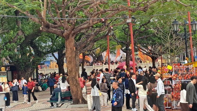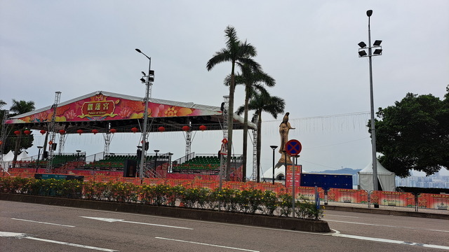 繞過交通管制的圓環,來到西灣湖畔。對岸是西望洋山(主教山),山頂豪宅林立,向來被戲稱為澳門的「天龍國」。沿海而行至融和門,這段路線與遊行時不同。海濱空地上,許多菲律賓人聚在一起玩賓果、聊天,節慶氛圍輕鬆自在。