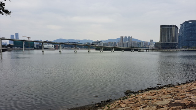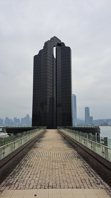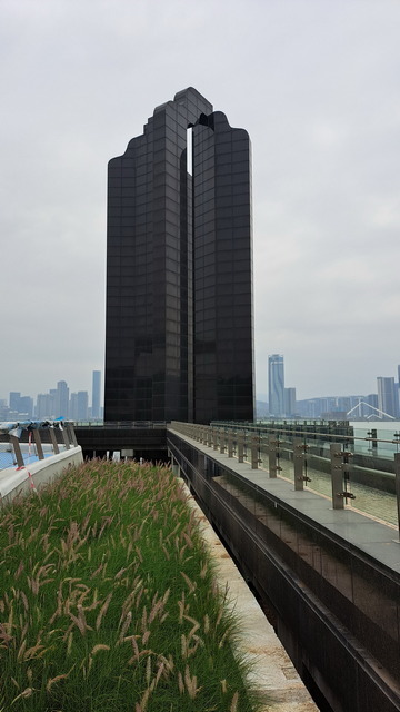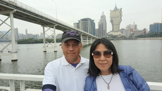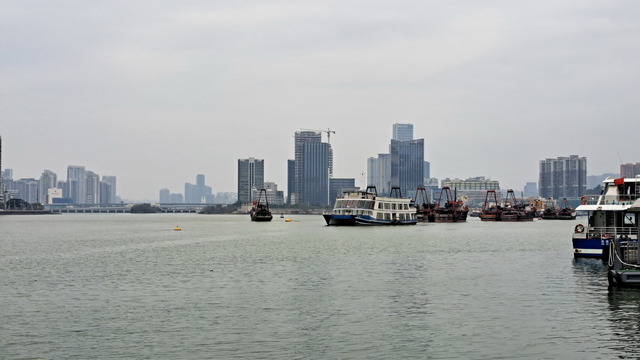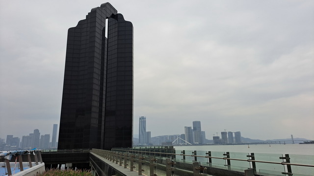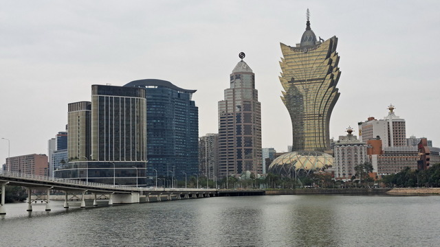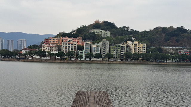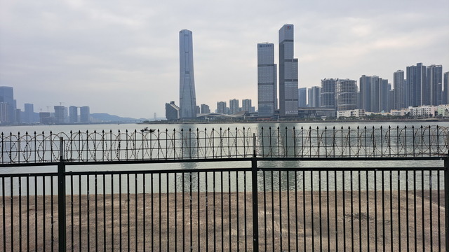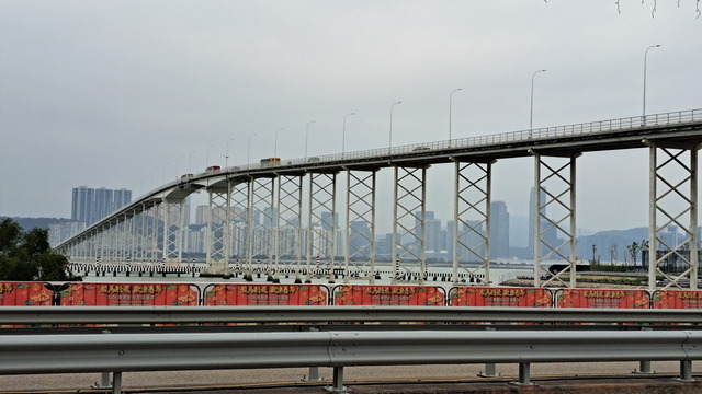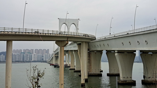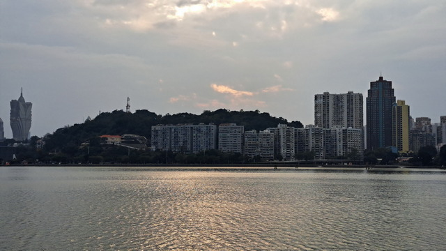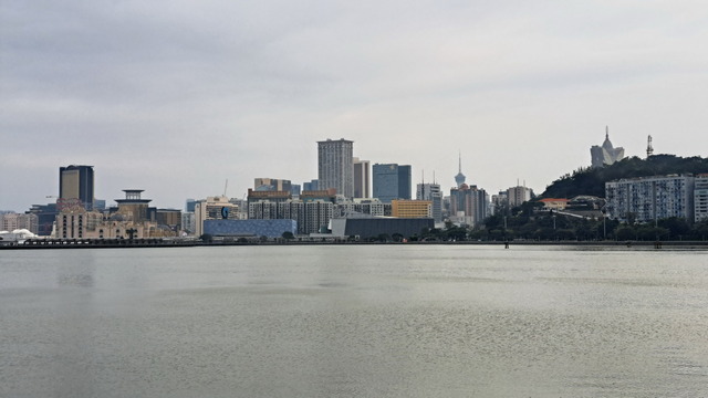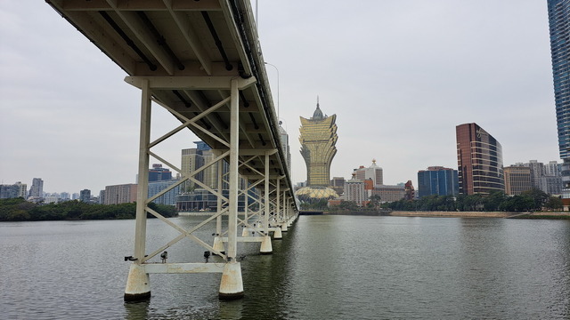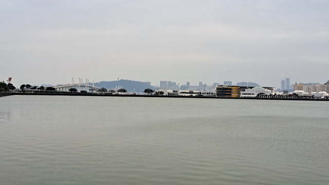 再出發,沿南灣湖畔前行,葡京為首的高樓群映照水面。穿過目前唯一可供行人通行的跨海大橋,風從海面吹來。