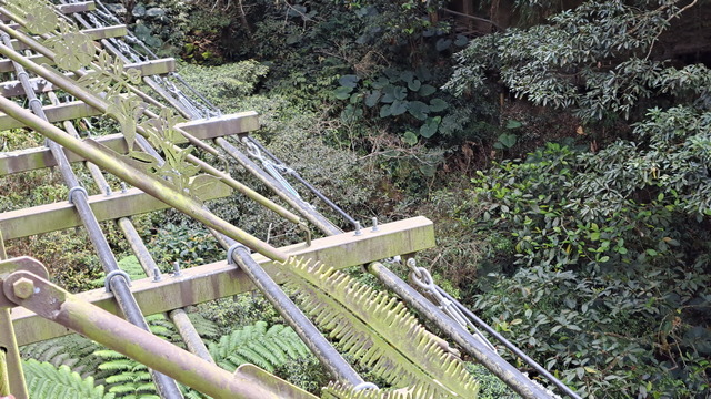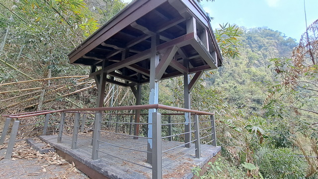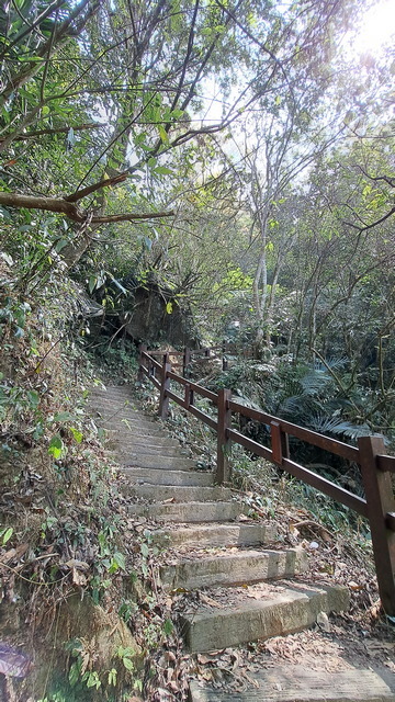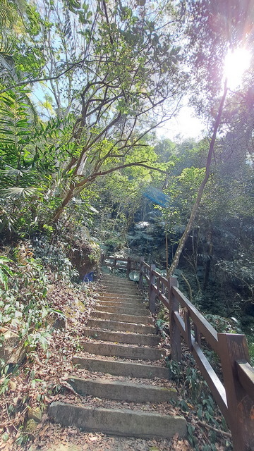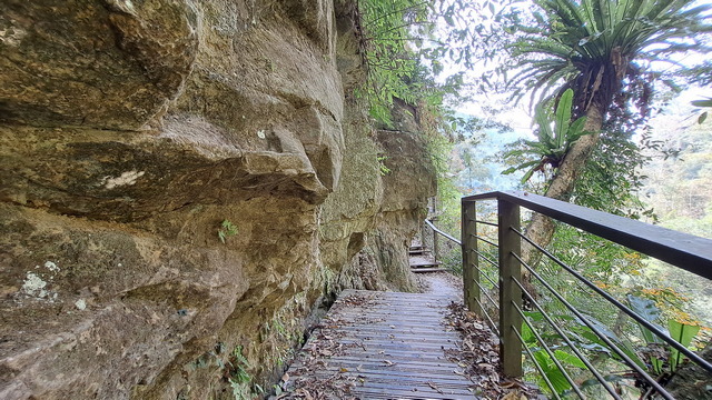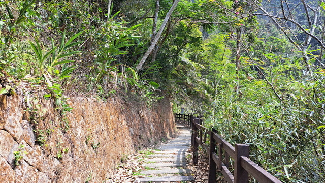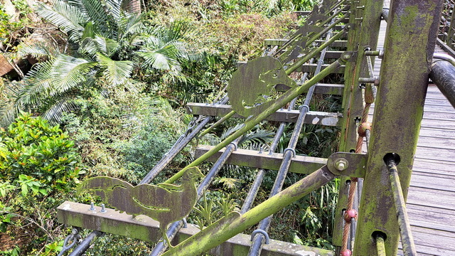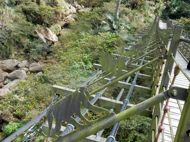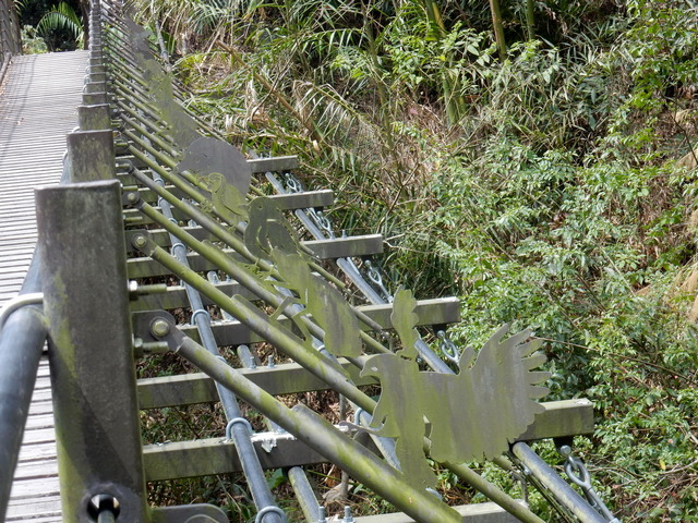 在涼亭稍作休息後繼續前進,途中會經過一段山壁,散落著數道小瀑布,統稱為「雷音瀑布群」。沿途需跨越兩座橋,其中一座設計頗具巧思:橋的左側是動物剪影藝術,右側則為植物剪影,相映成趣。