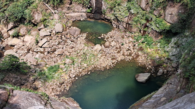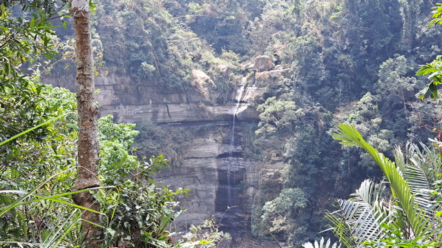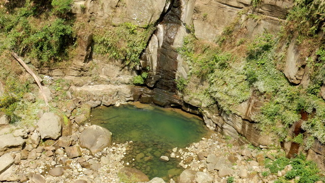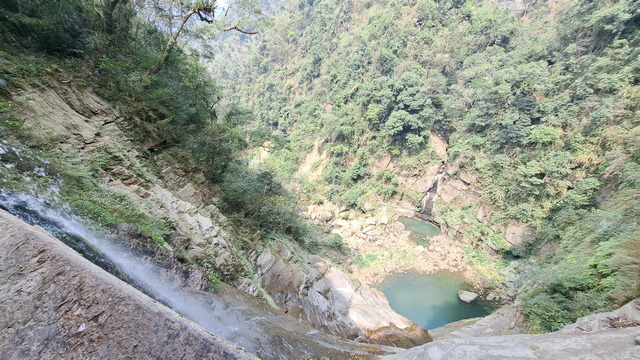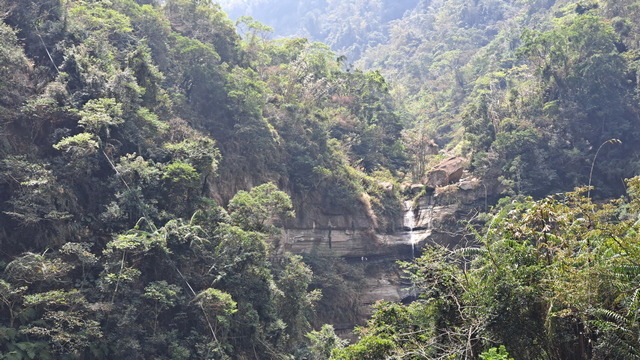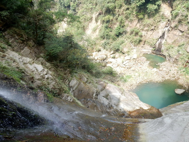 再往前不久,便抵達此行的終點:龍宮瀑布,這座瀑布曾被美國史密斯國家歷史博物館出版的《Smithsonia》雜誌評選為全台七座不可錯過的瀑布,老實說,這樣的評價似乎略顯誇張,這樣的瀑布在雲嘉山區至少有三座;然而龍宮瀑布確實有其獨特之處,那就是雙瀑夾谷:雙瀑夾峽而下,景觀別具一格。