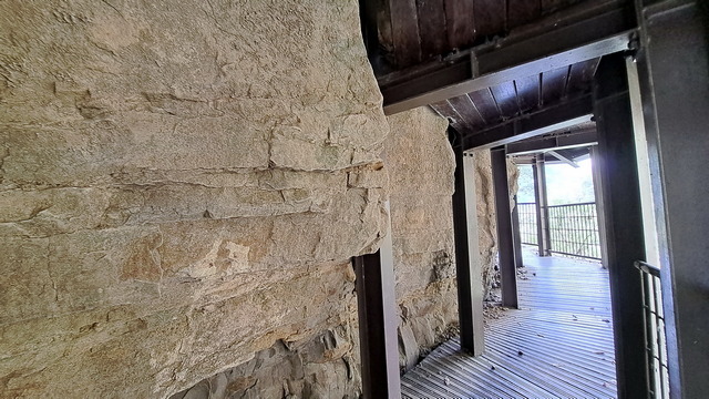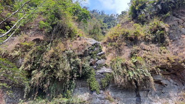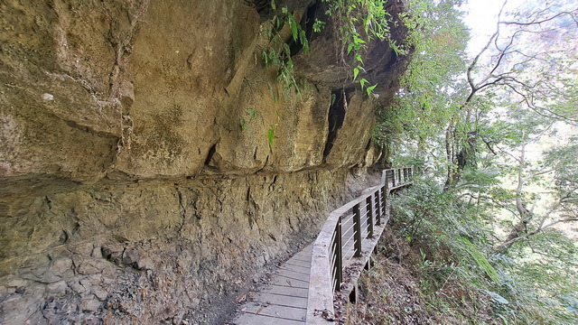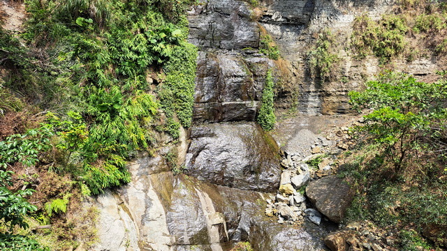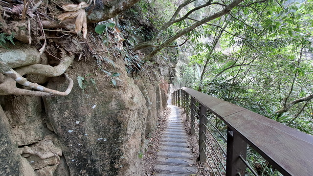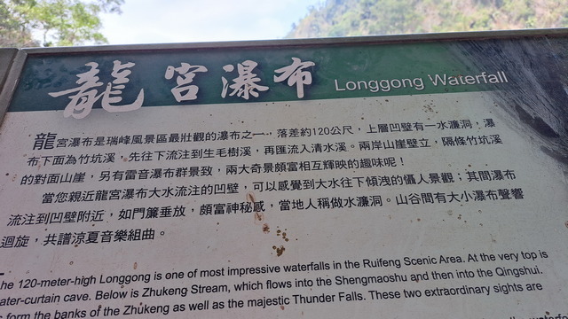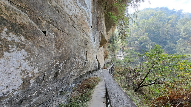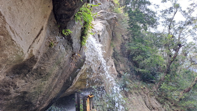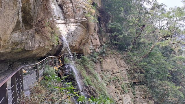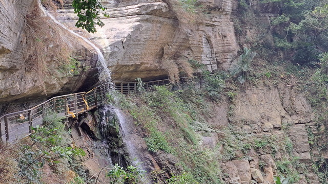步道傍山壁而建,綠蔭蔽日,走起來清爽宜人。行至涼亭處,龍宮瀑布已在遠方山頭招手,隱約還能聽到對岸遊客的談笑聲。瀑布周邊的岩壁地形宛如青年嶺「燕子洞」的翻版,必須彎腰穿過一段緊貼崖壁鑿出的石壁通道,那份奇險峻峭極具「太魯閣」的壯麗感;而瀑布由頂端垂墜而下形成天然水簾洞,可惜近期久旱少雨,昔日的銀龍飛瀑如今僅剩一抹涓流。