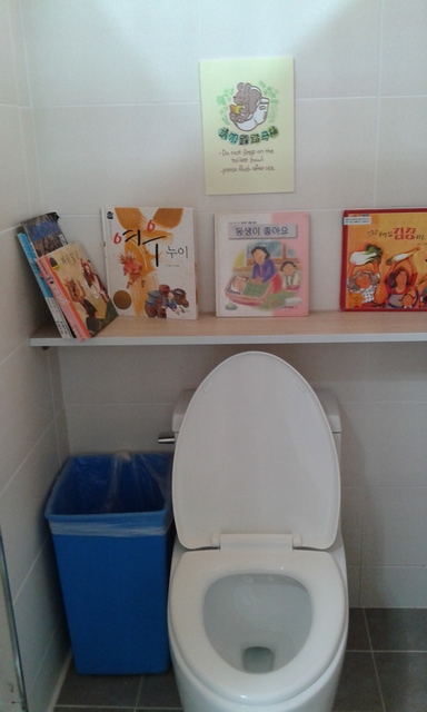 公厠裡面的每間厠所都很乾淨,在每間厠所裡,都有一個小小的書架,放了幾本繪本供大朋友小朋友閱讀。