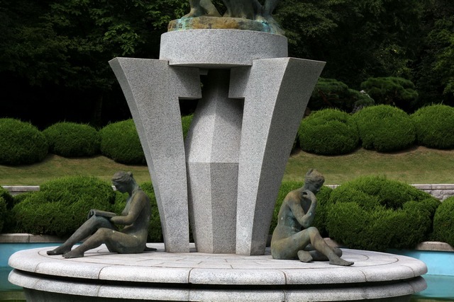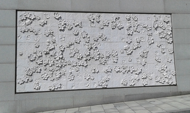 梨花女子大學是韓國首屈一指的女子大學,當然要利用這次旅行去朝聖,梨花女子大學的大門口,是一幅純白色的梨花石雕作品,上面一朵朵梨花是學校的象徵,個人很喜歡這個作品:清新、脫俗、典雅。