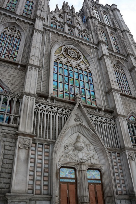 在歐洲式風格的建築物裡挾雜亞洲的元素:漢字、龍、亞洲臉孔的雕像,給人一種不協調的感覺。