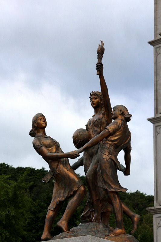 階梯旁的則是韓國臉孔的銅雕,