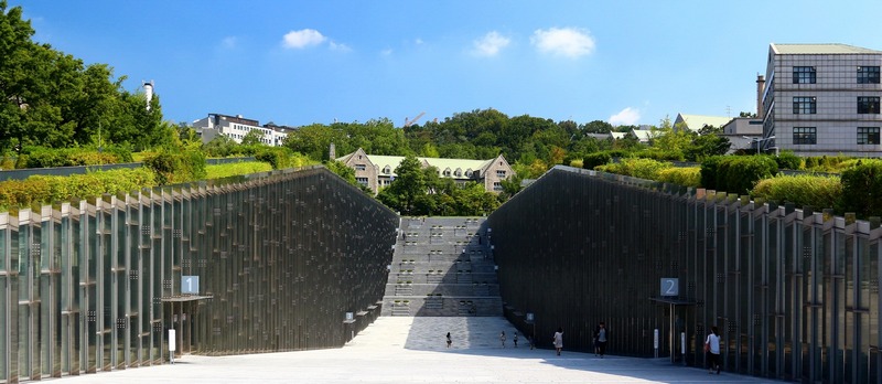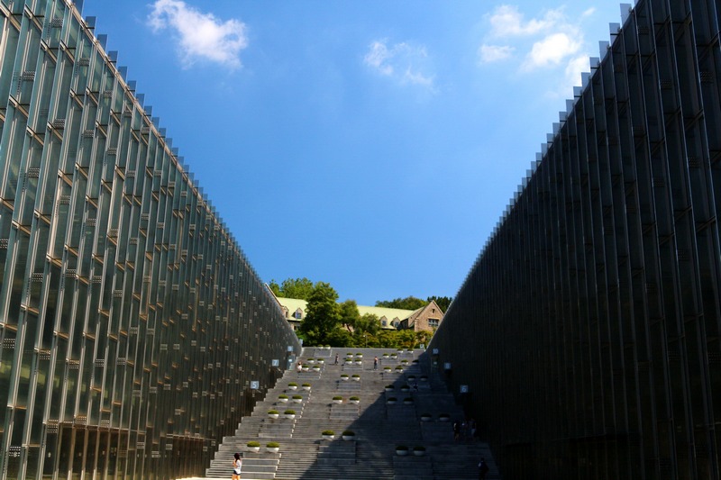 繼續往前走,來到梨花女子大學的著名景點:『大峽谷』,『大峽谷』是由法國建築師Dominique Perrault設計,由兩座如山坡般設計的建築物組合而成,中間是廣場、步道、階梯,走進這裡的感覺如同挾在兩座山壁之間的『大峽谷』,既壯觀又雄偉。