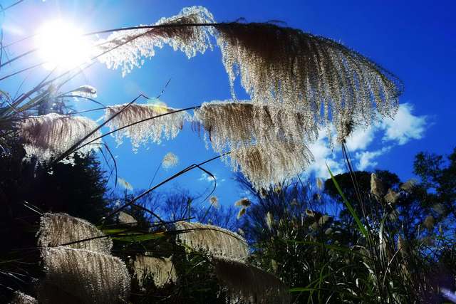 繼續往前走,如置身於電影院般,一剎那間,從一個場景跳到另一個場景,眼前的景色換成一片盛開的芒草花海,白茫茫的芒花在陽光照射下,閃閃發光,在微風吹動下的芒草花海,如白浪翻騰。隨風擺動的芒花,姿態曼妙,散發出蒼茫的風韻。