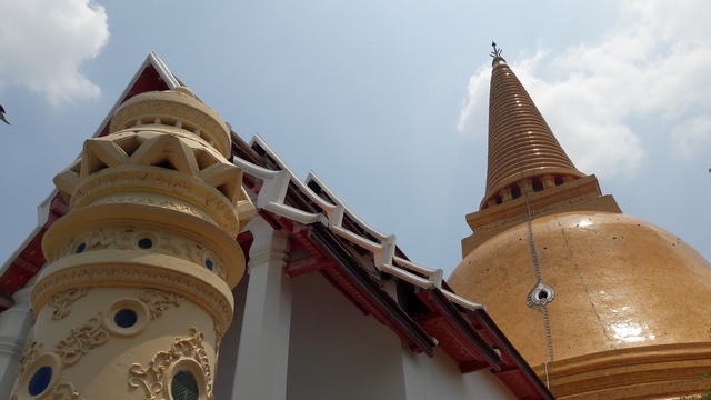 蠟像館參觀完畢後,接著去泰國最古老的名城:佛統,“佛統” 的意思是“原始”,泰國最古老的名城之一,已有3000年歷史,它是佛教最早傳入泰國的地方,故為泰國佛教史上的聖地。導遊直接帶我們參觀這裡的著名景點:大佛塔,泰國最古老、最大和最高的佛塔,世界著名佛塔之一,被稱為“佛統大金塔”,塔高為127米,呈螺旋狀的塔尖高40米,圓形塔底直徑為50米,塔身黃色琉璃磚,我們接近中午時分抵達,烈日當空,大佛塔在太陽照射下金光四射,