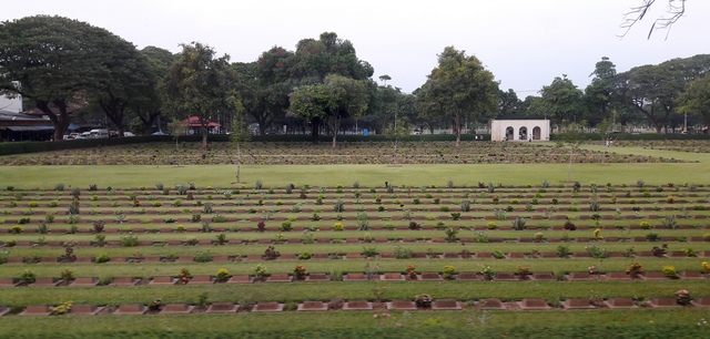 午餐後前往【 桂河鐵橋】 風景區,曼谷位於泰國中部,而桂河位於南部,所以我們已經從中部走到南部,當車子來到南部的北碧市,從車窗往外看,發現沿路是一區又一區的公墓,這些公墓埋葬第二次世界大戰期間客死異鄉的戰俘,突然間看到這麼多的墳墓,覺得很震驚! 因為少數人的貪婪、殘暴,造成數以十萬計無辜生命斷送在這裡,他們被餓死、病死、炸死、摧殘而死。
