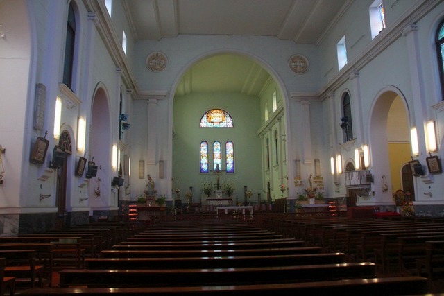 走進教堂裡面,可以感受到莊嚴肅穆的氣氛,白色的牆壁上鑲嵌著富有宗教藝術氣息的彩繪玻璃。